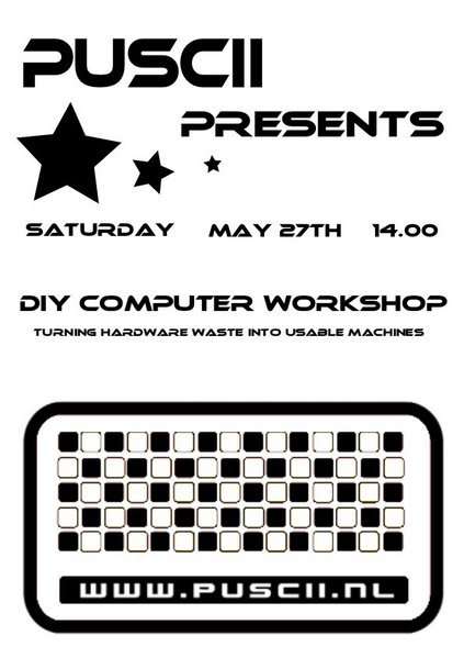 Aanstaande zaterdag zal er in de vrije internetwerkplaats PUSCII in Utrecht een DIY hardware workshop worden gegeven. Iedereen die geinteresseerd is kan leren zelf een computer samen te stellen uit de onderdelen die bij ons hardware-recycling project en de weggeefwinkel binnen zijn gekomen.