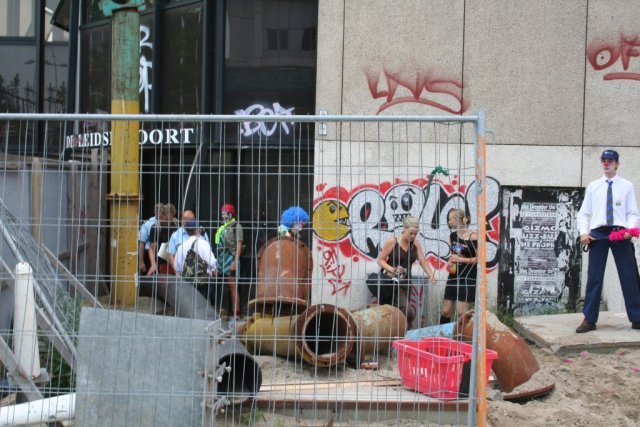 A squatter and the local mayor looking at the banner of V/D Putte. Loco-burgemeester brengt krakers op persoonlijke titel bezoek. Paul Jonas waarschuwt voor de reputatie van Van de Putte. Na een rustig verlopen nacht hebben de activisten van Woonstrijd!, die vrijdag een kantoorflat nabij Leiden CS hebben gekraakt, vanochtend bezoek gehad van wethouder en loco-burgemeester Paul Jonas. Deze kwam vanuit zijn functie als loco-burgemeester zich ter plaatse informeren over de situatie. Op persoonlijke titel kwam Jonas bovendien de actievoerders een hart onder de riem steken in verband met de reputatie van de eigenaar; Van de Putte heeft in zijn lange geschiedenis als speculant meer dan eens laten zien dat hij het inzetten van knokploegen niet schuwt. De actievoerders hebben Jonas het pand laten zien, en hem de plannen voor het pand uitgelegd. De kantoorflat zal in de komende week worden omgevormd tot vrijplaats en sociaal centrum. Woonstrijd! waardeert de steun, op persoonlijke titel, van de Leidse wethouder. Het ligt in lijn met het protest dat de gemeente Leiden, in navolging van vele andere gemeenten, heeft aangetekend tegen het dreigende kraakverbod. Uit de reactie op de kraakactie blijkt eens te meer dat een gemeente, wel degelijk gebaat is bij kraken, in de strijd die het moet aangaan met speculanten als Ronnie van de Putte. Ook andere gemeenten (Noordwijk, Sluis, Oisterwijk en een aantal locatie's in Belgie) hebben te maken met de smerige trucjes en spelletjes die de speculant speelt. Telkens blijkt, dat het zeer moeilijk is om iets te beginnen tegen een door een mistig web van B.V.'s afgeschermde speculant aan te pakken. De activisten blijven desalniettemin enigszins sceptisch over de door de gemeente aangespannen onteigenings-procedure ten aanzien van het gat van Van de Putte. Al in 2002 werd er door oud-wethouder Ron Hillebrand, aangekondigd een dergelijke procedure op te starten. De procedure zou zomaar twee jaar kunnen duren werd er destijds beweerd. In de tussentijd heeft Hillebrand meerder malen hetzelfde streven kenbaar gemaakt. Tot nu toe zijn er nog weinig signalen dat er ook daadwerkelijk maatregelen worden genomen. Woonstrijd! wil met de actie het nieuwe college dan ook aanmoedigen met maatregelen te komen tegen Van de Putte. In de loop van de week zullen dan ook meer actie's volgen en zal er verder worden gewerkt aan de opening van de vrijplaats. Een publieke presentatie van de vorderingen volgt op donderdag, de afsluitende dag van de actieweek. Van de Putte de stad uit! Kraken gaat door! Bijschrift foto: Een actievoerder laat Paul Jonas het spandoek aan de kantoorflat zien dat als herinnering aan het verleden van 'krottenkoning' Van de Putte werd opgehangen. De tekening is van actievoerders uit de jaren zeventig die ook toen al de strijd aangingen met de speculant. Einde persbericht