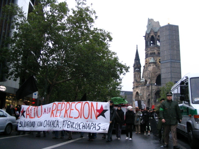 Onder de gebruikelijke politiebegeleiding verzamelden de demonstranten zich om 2 uur 's middags op de Breitscheidplatz. Verschillende solidariteitsgroepen waren aanwezig en er werden een aantal toespraken gehouden. De nadruk lag op het informeren van het publiek over de huidige toestand in Oaxaca, waar de strijd nog steeds dagelijks doorgaat. Verklaringen van oa. Radio APPO en de EZLN werden voorgelezen en iemand van Indymedia Duitsland las de verklaring van Indymedia NYC voor.
