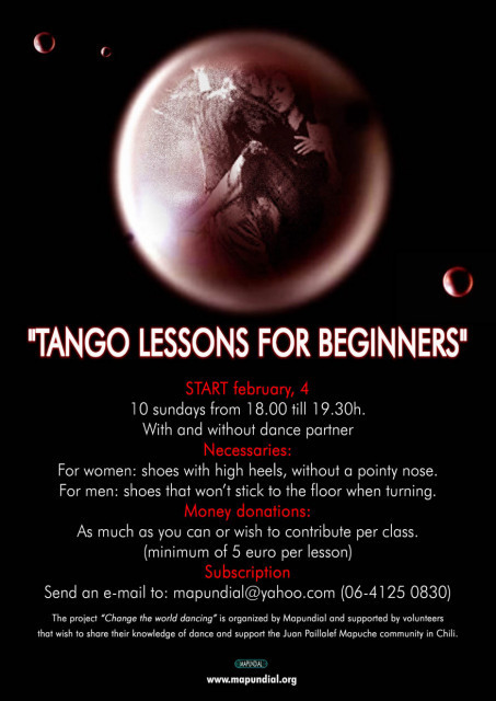 http://www.mapuche-nation.org/english/html/campaigns/juana_calfunao.htm  You can write many books explaning what is tango and everything they tell you is probably true. Tango is a human expression being naked and honest about one's feelings, it's like a key that opens the door between two universes that share the same energy. Like everybody is unique, so is every tango. During the lessons you can learn the tecniques and put your color in it, just by being yourself. "Tango lessons for beginners" Sunday, 4 february 18.00h Sunday, 11 february 18,00h Sunday, 18 february 18.00h Sunday, 25 february 18.00h Sunday, 4 march 18.00h Sunday, 11 march 18.00h Sunday, 18 march 18.00h Sunday, 25 march 18.00h Sunday, 1 april 18.00h Sunday, 8 april 18.00h Teachers: Yerpun & Valeria LOCATION: Sara Burgerhartstraat 25 - XI , Amsterdam (building Elsevier, try to be in the front of the "back door" before 18.00h) Contact: 06- 4125 0830 Money donations: As much as you can or wish to contribute per class. (minimum of 5 euro per lesson) Exchange: Students can also exchange workshops for volunteer work (1 to 2 hour p/w) this may be handing out information, flyering, supporting actions, organising benefit parties, concerts and/or performances. (your input will be apreciated.) Barter System: Runs according to the nessecities of the community needes, ie- Computers, clothe, tools, ect.) Mapundial is an ONG founded to spread the knowledge and culture of the Mapuche-indians and to realise projects in Chili in collaboration with Mapuche-organisations and communities to improve their rights. The Mapuche are the original habitants of the territory today known as Chile.The Mapuche are not constitutionally recognised as a people. As a reaction to this situation, various mapuche-communities have united themselves in a network to defend the human rights of the indigenous people. E-Mail: mapundial@yahoo.com Website: http://www.mapundial.org |