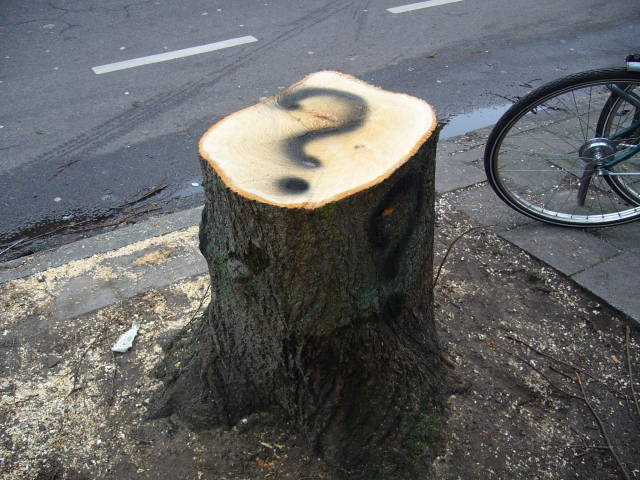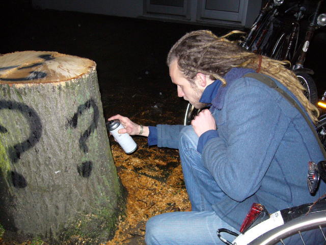 Het toekomstige plan van herstructurering is de Biltstraat om te toveren in een heuse winkelboulevard met bredere trottoirs en meer winkels. De gevolgen, buiten het feit dat deze authentieke lindebomen nu gekapt zijn, betekent dat het gebied binnen afzienbare tijd overbevolkt zal raken met overhaastig consumentenvee, schrijnende kermisverlichting en nog meer parkeerplaatsen. De gemeente Utrecht heeft de belofte gedaan om het groen met een 26-tal jonge bomen te zullen gaan compenseren. Dit zullen uiteraard geen lindebomen zijn vanwege een plakkende voorruit bij de klagende binnenstadautomobilist. Een onomkeerbaar feit blijft nu eenmaal dat lindebomen een licht stroperige substantie via de stam afscheiden (die rotnatuur ook….). Dit alles heeft ertoe geleid dat een aantal natuurminnende Utrechtenaren uit de directe omgeving zich gedwongen voelden, om op ludieke wijze de conversatie met betrekking tot de omstreden boomkap met een groot vraagteken aan te wakkeren.