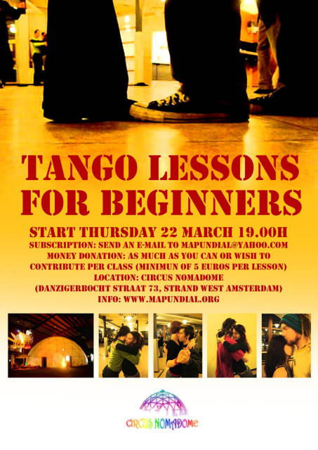 We invite you to join the Tango curse of the project "Change the world dancing" . This project solidarises with the Juan Paillalef Community, as they fight for their human and land rights. Watch Video Juan Paillalef Mapuche community: http://mapundial-ong.blogspot.com/  Tango Lessons for beginners You can write many books explaining what tango is and everything they tell you is probably true. Tango is a human expression being naked and honest about one's feelings, it's like a key that opens the door between two universes that share the same energy. Like everybody is unique, so is every tango. During the lessons you can learn the techniques and put your colour in it, just by being yourself. START thursday, 22 march 19.00h Thursdays, 22,29 march Thursdays, 5,12,19,26 april Thursdays, 3,10,17,24 May Subscription: send an e-mail to: mapundial@yahoo.com Money donation: As much as you can or wish to contribute per class (Minimun of 5 euros per lesson) Location: Circus Nomadome (Danzigerbocht straat 73, strand west Amsterdam) More info: http://www.mapundial.org Map: