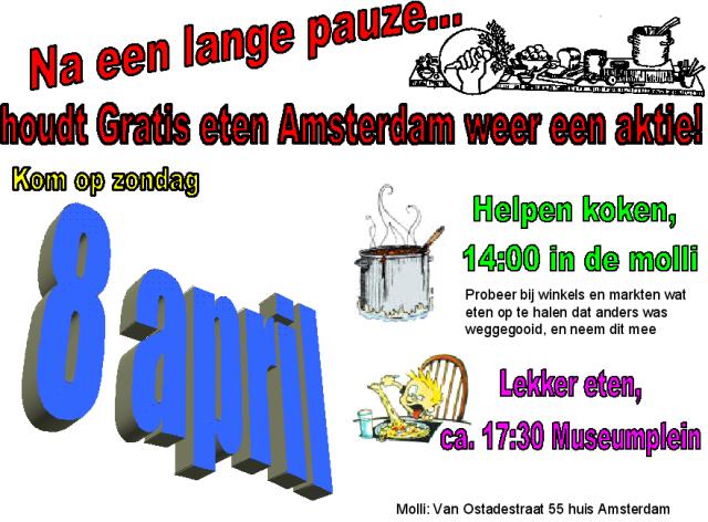 8th of April, Food not Bombs. 2 pm cooking in the Molli, 5,30 pm food at the museumplein. Bring some food!!!