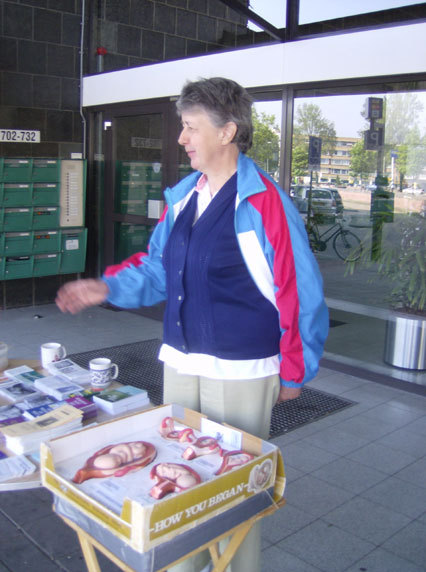 antiabortusactivisten bij ingang kliniek  "pro abortus=bezeten door satan"  foetussen voor ingang kliniek verslagje van Krijtje: mijn interessantste ontdekking van vandaag is dat de hier afgebeelde schreeuw om leven activisten, fel tegen abortus, in het wijkgebouw zuid (strevelsweg 700) gesteund worden door het bedrijf Mercy Ships, 3e verdieping nummer 317. ze bergen daar hun actiemateriaal en vergaderen er na afloop. de manier waarop deze mensen picketen bij abortusklinieken vind ik zeer kwalijk. vandaar ook deze oproep aan pro choice mensen om daar ter plekke tegengas te geven. de schreeuw om leven staat iedere eerste werkdag van de maand smorgens voor de ingang van het wijkgebouw zuid, strevelsweg 700, waar de abortuskliniek Casa gevestigd is. medewerkers van de kliniek zijn al verschillende keren binnen in het gebouw lastig gevallen door deze antiabortusactivisten. het lijkt me dus ook zaak dat het bedrijf Mercy chips stevig aangesproken wordt door pro choice mensen op het feit dat ze deze mensen het gebouw in halen. omdat ik voor recht op abortus ben werd ik door de dame op foto 2 uitgemaakt als zijnde "door de duivel bezeten." ze hebben (zie foto 3) afbeeldingen van foetussen vlak voor de ingang van de kliniek gelegd, waar klanten die een abortus ondergaan dus wel langs moeten lopen. een medestander van hen vertelde me dat "iemand die een abortus laat doen zelf gedood zou moeten worden."de schreeuw om leven activisten waren het met hem eens. hiermee roep ik pro choice mensen die in Rotterdam of omgeving wonen en tijd hebben een pro choice mening te uiten op de genoemde plek op om elke eerste werkdag van de maand daar om ongeveer tien uur sochtends heen te gaan. E-Mail: anti-sgp@gmx.net Website: http://www.sgpnee.nl | | bewijs dat ze binnen lopen | Krijtje v.d. Stoep - 01.06.2007 15:44