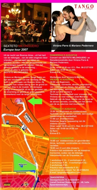 VIVIANA PARRA & MARIANO PEDERNERA IN "CHANGE THE WORLD DANCING!" This project solidarises with the Juan Paillalef Community, as they fight for their human and land rights. This project is organized by Mapundial and supported by people that wish to share their knowledge of dance and support the Juan Paillalef Mapuche community.   9, 10, 11 en 12 Augustus Concert,Dansdemonstratie, Workshops, Diner en Salon in CIRCUS NOMADOME Sexteto Milonguero, Viviana Parra & Mariano Pedernera, Dj Lucien en Dj Remi. Uit de nacht van Buenos Aires…uit het hart van de milongas…van de tafel omgeven door vrienden…van het spel van kijken en bekeken worden…van het geroezemoes van opmerkingen tussen de tandas…van het geheim gedeeld in de omarming… vanuit dit alles is geboren het SEXTETO MILONGUERO. Viviana en Mariano dansen Tango Salón en zijn een voorbeeld van wat vandaag de dag leeft in de milongas van Buenos Aires. Zij bewegen hun voeten stevig over de grond en het hart diep in de muziek. Dit danspaar nodigt onvermijdelijk uit tot het genieten van de omarming zo gewild en goed geplaatst, kenmerkend voor de tango milonguero. DONDERDAG 9 AUGUSTUS Concert van SEXTETO MILONGUERO en Dansdemonstratie door Viviana Parra & Mariano Pedernera. Dj Lucien Diner vanaf 18.00 uur. € 5.- Res. 06-21271030 Salon van 19.00 tot 24.00h. Entree:€ 8.- Workshops door Viviana & Mariano VRIJDAG 10 AUGUSTUS 19:00 uur Beginners Caminatas, connectie, abrazo, verandering van richtingen en ritmes. Het gebruik van het standbeen, eenvoudige combinaties. 20:30 uur Alle niveau’s Techniek en muzikaliteit voor vrouwen (met Viviana) en voor mannen (met Mariano) Gebruik van de heup, rotatie van de torso en de abrazo cerrado, correctie van het verlies van de as, adornos met muzikaliteit. ZATERDAG 11 AUGUSTUS 15.00 uur Beginners en middenniveau Techniek van de abrazo cerrado, eenvoudige combinaties en muzikaliteit. 17:00 uur middenniveau Sistemas, begrip, toepassing van de sistema cruzado. Diner vanaf 18.00 uur. € 5.- Res. 06-21271030 Salon van 19:00 tot 24.00 uur Dj Remi Entree:€ 5.- ZONDAG 12 AUGUSTUS 14:00 uur middenniveau en gevorderden Giros, techniek, combinaties en ritmische variaties. 16:00 uur (3 uur) Alle niveau’s. Práctica met assistentie van de maestros. Correcties, codes van de milonga, interpretatie van de Orquestas, etc. 1 workshop € 15.- 2 workshops € 28.- 3 workshops € 40.- 4 workshops € 52.- 5 workshops € 65.- Práctica met assistentie € 10.- Inschrijven en contact: Tel: 06-41586253 E-mail: tangosfera@yahoo.com CIRCUS NOMADOME Danzigerbocht 73, Amsterdam (nearby Strand west) vanaf Centraal Station bus 22 - 48, halte Spaardammerdijk ROUTE: