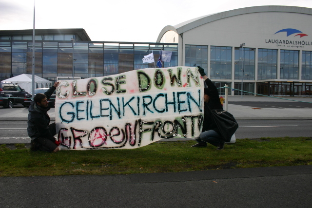 [English Original] Op zondag 6 oktober ontving de Steungroep Vrienden van GroenFront! de volgende verklaring: "Vandaag hebben internationale activisten voor de ingang van de NAVO-top in IJsland een spandoek uitgerold met de tekst: