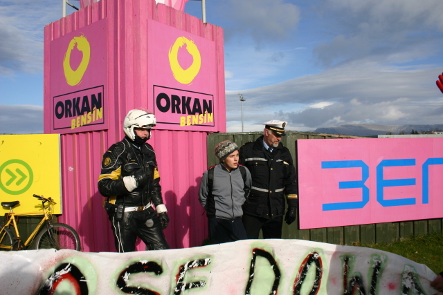Saving Iceland Tegelijktijd klom een andere activist in de verlichtingsstellage boven het stadion waar de NAVO-top gehouden werd. Daar werd een spandoek ontrolt met de tekst: "Check this Yoko." Hiermee werd Yoko Ono opgeroepen om terug te keren naar haar oude humanitaire principes en niet langer geld te verdienen aan het omstreden OR (Orkuveita Reykjavíkur). Zij zijn namelijk verantwoordelijk en schuldig aan het op grote schaal vernietigen van ongerepte natuur in IJsland. Dit alles gebeurt om ruim baan te maken voor de aluminiumindustrie die die zich in IJsland aan het vestigen is. De aluminiumindustrie is op en haar beurt weer sterk verbonden is met het militair-industrieel-complex.[Einde vertaalde verklaring]