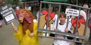 Deze week voeren vrijwilligers van Compassion In World Farming (CIWF) in het stadscentra van Ede, Zaandam en Katwijk actie tegen legbatterijen en andere kippenkooien. Voorbijgangers kunnen dan als een 'gekooide kip' achter de tralies op de foto gaan als protest tegen de legbatterij. De foto's worden direct per e-mail naar de Europese Unie, landbouwminister Verburg en de Tweede Kamer gestuurd.  In Nederland leven ongeveer 10 miljoen kippen in legbatterijen. Voor de EU is dit cijfer ca. 350 miljoen. De legbatterij is een opeenstapeling van kleine en krappe kooien waarin telkens vier of vijf kippen zitten opgesloten. In deze kooien kunnen kippen zich niet natuurlijk gedragen: ze kunnen hun ei bijvoorbeeld niet in een nest leggen, niet met de vleugels fladderen en geen stofbad nemen om hun veren te onderhouden. Per kip is 550 cm2 beschikbaar: dat is minder dan de oppervlakte van een A-viertje! Met ingang van 2012 zijn legbatterijen in de EU en in Nederland niet meer toegestaan, maar de eierindustrie dringt aan op uitstel van dit verbod. CIWF voert daarom een internationale campagne om het verbod, waartoe in 1999 besloten werd, onverkort te handhaven en het zelfs uit te breiden met een verbod van alle kooien voor legkippen. Ook in de kooitypen die na 2012 nog zijn toegestaan wordt het welzijn van de dieren namelijk ernstig geschaad. Scharrelstallen en vrije uitloopsystemen bieden de dieren veel meer welzijn. Deze actie maakt deel uit van een landelijke toernee, die dit najaar plaatsen in heel Nederland bezoekt. Sittard en Hilversum waren al aan de beurt, deze week staan Ede (15 oktober), Zaandam (18 oktober) en Katwijk (20 oktober) op het programma. Wie niet aan de actie op straat mee kan doen, kan ook meedoen via internet. Op de speciale actiewebsite geenkipineenkooi.nl staat een e-mailpetitie en de webtest: 'Wat weet jij van de kip en het ei?', waarin je in 12 vragen en een paar minuten alles te weten komt wat iedereen zou moeten weten over kippen en eieren! |
