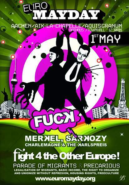 MaydayMayday  zerkelmarcozy Nicolas Sarkozy zal Angela Merkel de Karlspreis, de 'oscar van de EU', overhandigen. Ironisch genoeg valt dit jaar de syndicalistische Mayday samen met de katholieke hemelvaart, de dag waarop de Eurocraten traditioneel hun prijzen uitdelen. Het duo feliciteert zichzelf met het feit dat ze erin geslaagd zijn de Europese Unie af te schermen van de sociale eisen van de mensen, die al lang schreeuwen om een einde te maken aan de vrije markt theologie in Europa. Het nieuwe Europese heersend paar is druk bezig het continent om te toveren tot een politiestaat en zou maar al te blij zijn indien ze de ketterse betekenis van Mayday, en haar anarchistische en socialistsiche tradities in Europa, voorgoed uit het collectieve geheugen kunnen wissen. Dit jaar op Mayday vechten twee werelden tegen elkaar: de globale verzetsbeweging VS de ijzeren vuist van de regeringen; grassroots netwerken en sociale centra VS de macht van de EU; Utopische maatschappij VS kapitalistische markt; Het radicale Europa van de multitudes VS het conservatieve Europa van de elites. Wij zullen roet in het eten van de machtigen gooien, door chaos te ontketenen in Aken en ons eigen feestje te bouwen: de Euromayday parade. Deze transeuropese demonstratie van precairen en migranten gaat door in meer dan 20 steden, tégen de sociale oorlogsvoering, discriminatie en grenscontroles. Wij, het Euromayday netwerk, zullen niet toelaten dat Mayday omgevormd wordt tot de Hemelvaart der sterren van een falend regime in het katholieke, NAVO-gezinde Europa. We verwerpen Keizer Karel als een symbool van Europa, net zoals we het neoliberalisme van de Barroso comissie en het monetarisme van Trichet's centrale bank verwerpen. Gedwongen om in de precaire hel te leven, zullen we de hemel van de Europese elites met de grond gelijk maken. Mis deze unieke gelegenheid niet: doe het schaamrood op de wangen van de heersende tweeling rijzen, onthul hun autoritaire arrogantie, voeg je bij de duizenden die naar Aken (dichtbij Keulen) komen om deel te nemen aan het sterkste protest ooit tegen de kern van de euromacht. Toon Angie en Sarko waartoe de Europese beweging tegen neoliberalisme in staat is. Kom naar de speciale Euromayday protest+parade+party die de collectieven in Aken, Luik, Maastricht en andere steden in de regio organiseren. Faciliteiten, onthaal en voedsel wordt voorzien in Aken in de dagen voor en na de eerste mei. Activisten, artiesten, hackers, vakbondsleden, migrantenorganisaties, queer collectieven, kritische cyclisten, media creatieven, linkse radicalen van alle kleuren, rood, zwart, groen, roze, paars, zilver,... komen allemaal naar Aken en andere Euromayday parades om de strijd te vervoegen. De eerste mei in Aken: Ochtend: PROTESTEN in de buurt van het Rathaus waar de Karlspreis door Sarkozy aan Merkel ovehandigd zal worden. Namiddag: Euromayday PARADE begint vlakbij de plaats van het protest Avond: Euromayday PARTY E-Mail: emd-aix@blablaxpress.org Website: http://www.euromayday.org |