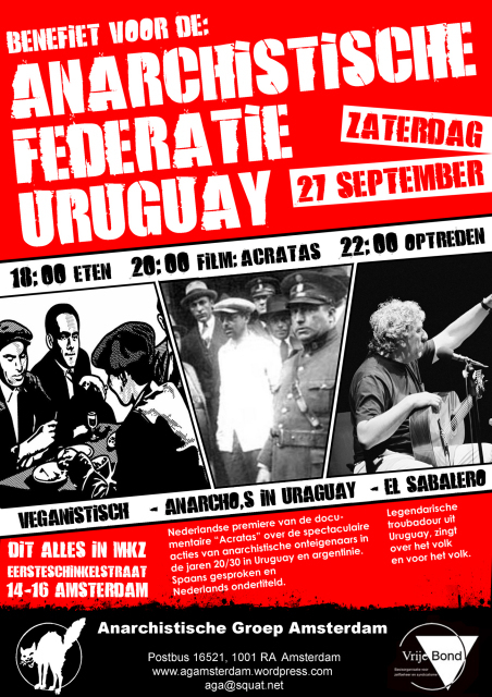 Benefiet in de MKZ (alweer) deze keer voor de Anarchistische Federatie Uruguay. met eten, livestream, film, muziek, infostand en meer. kom ook !  BENEFIET voor Anarchistische Federatie Uruguay (F.A.U.) 27 september eten 18.00 uur film 20.00 uur Nederlandse premiere van de documentaire "Acratas" over de spectaculaire acties van de anarchistische onteigenaars in de jaren '20/'30 in Uruguay en Argentinie, Spaans gesproken, Nederlands ondertiteld. Daarna: Live internet verbinding (beeld&geluid) met anarchisten in Uruguay 22 uur optreden: El Sabalero legendarische troubadour uit Uruguay, zingt over het volk en voor het volk Het opgehaalde geld wordt besteed aan de heruitgaven van het boek over de geschiedenis van de anarchisten in de periode 1955 tot de militaire coup in 1973. In de MKZ Eerste Schinkelstraat 14-16 Amsterdam Anarchistische Groep Amsterdam/de Vrije Bond postbus: 16521 1001 RA Amsterdam E-Mail: aga@squat.net Website: http://www.agamsterdam.wordpress.com |