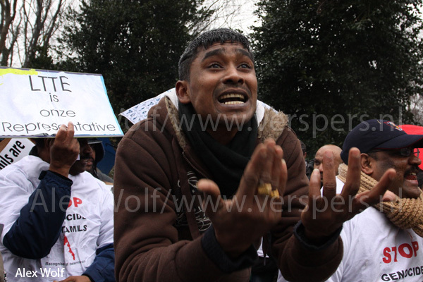 In Den Haag demonstreerden vrijdag 27 februari ruim honderd Nederlandse Tamils voor de ambassade van India tegen de gewelddadigheden in Sri Lanka.