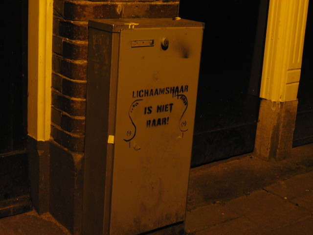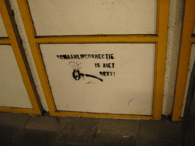 Met het oog op Internationale vrouwendag zondag 8 maart hebben gezamelijke groepen feministes en feministen afgelopen nacht de stad Amsterdam versierd met vette spuitmallen. Op de spuitmallen stonden teksten als 'schaamlipcorrectie is niet sexy', 'lichaamshaar is niet raar' en de oude vertrouwde 'baas in eigen buik'... We leven in een wereld waar seksistische praatjes, agressieve vrouwonvriendelijke reclame foto's, commerciele uitbuiting van het vrouwenlichaam, huiselijk geweld en verkrachting aan de orde van de dag zijn. En in een systeem dat gefundeerd is op onderdrukking en uitbuiting zullen vrouwen nooit vrij zijn. Vrouwen zijn mooie sterke mensen, die in staat zijn keuzes te maken, voor zichzelf op te komen en te vechten voor hun positie. Weg met het kapitalisme en dood aan het patriachaat!!! |