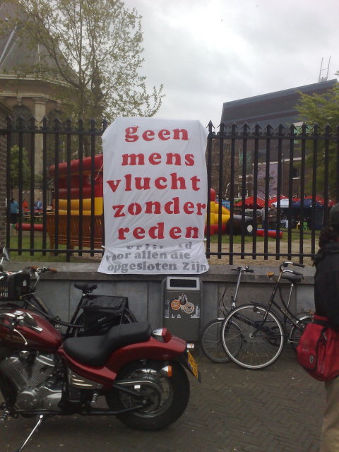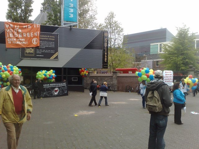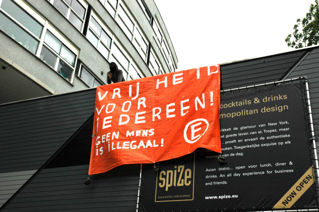 Op 5 mei voerde een tiental anti-fascisten van de Anti-fascitische Actie (AFA) Den Haag actie bij de openbare naturalisatie ceremonie. Anti-fascisten deelde voor de deur zo'n 600 flyers uit en er werd een spandoek met de tekst “vrijheid voor iedereen, geen mens is illegaal!” van het dak van het Theater aan het spui neergelaten, waar de ceremonie plaatsvond.  Deze dag ontvingen ongeveer 50 mensen officieel hun Nederlanderschap tijdens een verplichte ceremonie. Fijn dat voor deze mensen een vaak lange periode van onzekerheid achter de rug is en zij nu eindelijk met een gerust hart hun nieuwe bestaan verder kunnen opbouwen. Het is echter bijzonder wrang dat juist op bevrijdingsdag, de dag dat 'Nederlanders' hun vrijheid vieren deze verplichte ceremonie plaatsvindt. Wrang, omdat in Nederland elke dag honderden mensen opgesloten zitten in vreemdelingendetentie. Niet omdat ze iets misdaan hebben, maar omdat ze niet over de juiste papieren beschikken; omdat ze toevallig in een ander land dan Nederland zijn geboren. Wij vieren onze vrijheid, maar ontnemen tegelijkertijd anderen hun vrijheid en sluiten hen op als misdadigers. Mensen zoals u en ik, alleen hebben zij de pech dat ze zich geen 'Nederlander' mogen noemen. De mensen die wel het 'geluk' hebben om nu Nederlander te mogen worden moeten nu ook nog eens komen opdraven om een verplicht nummertje af te werken om te tonen hoe dankbaar zij zijn om nu ook bij 'ons' te horen. Ook op 5 mei wordt nog eens bepaald hoe deze mensen hun vrijheid mogen, zelfs moeten, vieren. Het is cynisme ten top om onze vrijheid te vieren als anderen nog steeds onschuldig opgesloten zitten. Als andere mensen NIET de kans krijgen hun vrijheid te vieren. Want we zijn pas echt vrij als we allemaal vrij zijn, en anderen als vrije mensen behandelen. Solidariteit met mensen zonder papieren! Geen mens is illegaal! Website: http://www.afadenhaag.nl |