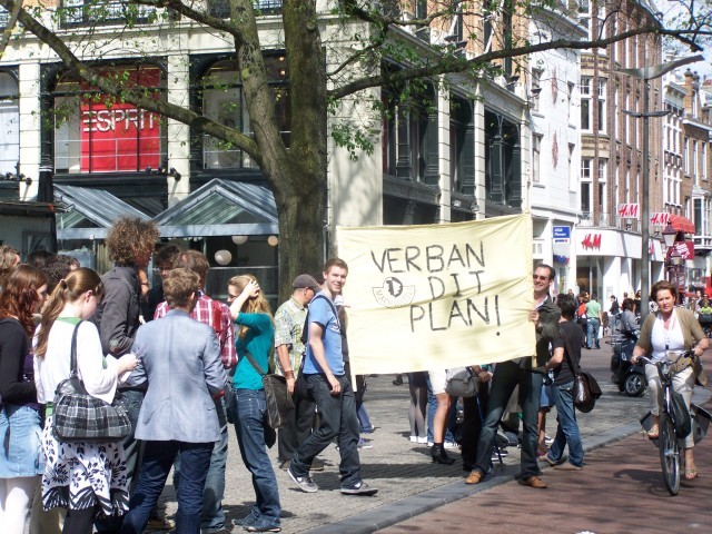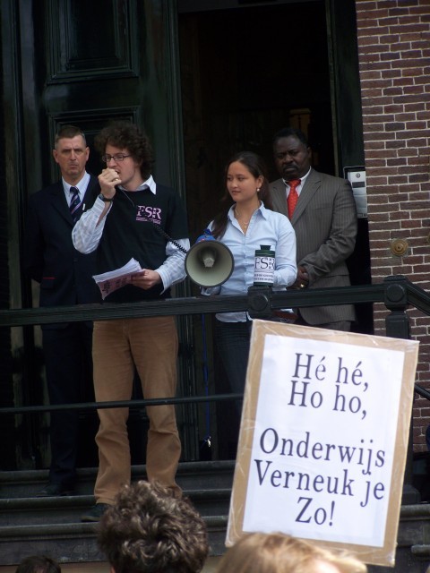Vandaag demonstreerden zo'n 125 mensen van 4 tot 5 voor het maagdenhuis in Amsterdam tegen de plannen van het College van Bestuur (de directie van de UvA) om zwaar te bezuinigen op de Faculteit Geesteswetenschappen (tussen de 3.2 en 4.9 miljoen per jaar). En dit ondanks het feit dat het aantal leerlingen daar de laatste jaren enorm is toegenomen. Hoewel voor de actie nauwelijks was gemobiliseerd (het was nogal last-minute), kwamen er toch ruim over de honderd studenten op af. De organisatie lag vooral in handen van de studentenraad, hoewel radicalere (studenten)groepen aanwezig waren (onder andere vanuit utrecht waren mensen gekomen). Dit alles vindt plaats tegen de achtergrond van het oprichten van twee nieuwe platforms. HOHP ( http://www.hohp.nl/) is een brede en (daardoor) gematigde organisatie, en hiernaast is er sprake van een andere platform (nog zonder naam en zonder site) van voornamelijk linkse activisten onder de studenten (zoals de Universitaire Activisten, Anomalous Wave Netherlands, Kritische Studenten Utrecht enz.). Zij organiseren overigens op 2 juni om 20.00u een bijeenkomst getiteld "Universities under attack? From the Bologna process to the privatization of knowledge" in de Muziekzaal bij Crea (Turfdraagsterpad, bij de UvA). Is dit het begin van een opleving van de studentenbeweging in Nederland? Laten we het hopen, maar laten we dit ook niet overlaten aan toeval, en laten we proberen de strijd die op verschillende plaatsen los zal gaan breken in de komende jaren met elkaar koppelen. Solidariteit! |