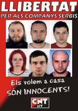 Belgrade ASI yesterday informed the IWA sections, that the Belgrade 6 have now officialy been charged with "International terrorism" and their remand been extended by another –the third– month. This is terrible news and we must do all it can to suport our comrades. We hope there will be more detailed information within the next few days.   De 6 anarcho-syndicalisten uit Belgrado, sinds 5 september gearresteerd en gevangen gehouden, worden vervolgd voor internationaal terrorisme. Ze worden bedreigd met gevangenisstraffen van 15 jaar. Ze worden er van beschuldigd de schrijvers te zijn van graffiti die op 25 augustus op de Griekse ambassade is geverfd, en van het gooien van een brandbom, die alleen een raam beschadigde. Over het feit dat de kameraden ontkennen dat ze iets te maken hebben met deze gebeurtenissen maakt de Servische staat zich geen zorgen, in diens obsessie om iemand schuldig te verklaren. Inderdaad, van Parijs tot Belgrado, lijkt de internationale politie veel op elkaar. Ze moeten de zelfde instructeurs hebben gehad. Dus, de kameraden worden aangeklaagd voor internationaal terrorisme. In de nabije toekomst betekent dit dat ze in ieder geval enkele maanden gevangen zullen blijven zonder vergunning voor bezoek. Deze kameraden die nog vrij zijn proberen na te gaan of er een manier is om tegen het besluit in beroep te gaan. Verdere informatie zal volgen. Ondertussen is het slechtst mogelijke scenario nu gebeurd. De strijd zal lang en moeilijk zijn en deze kameraden zullen al onze steun nodig hebben. De kosten voor advocaten zullen duidelijk extreem hoog zijn, dus iedereen die financieel wenst bij te dragen aan solidariteit inspanningen kan een cheque sturen naar de CNT AIT, met de woorden "Solidarite Belgrade" op de achterkant, naar het volgende adres: CNT AIT 108 rue Damremont 75018 Parijs --------------------------- The Belgrade 6 charged with "international terrorism" The 6 anarcho-syndicalists from Belgrade, arrested and held in confinement since 5th September last, are to be tried for international terrorism. They face 15 years in prison. They are accused of being the authors of graffiti painted on the Greek embassy last 25th August, and of having thrown a petrol bomb which only damaged a window. The fact that the comrades deny that they had anything to do with these events clearly does not worry the Serbian State in its obsession to find someone guilty. Indeed, from Paris to Belgrade, the international police are all very much alike... They must have had the same instructors... So, the comrades are being charged with international terrorism. In the near future, this means they will remain incommunicado in jail for at leastseveral months. Those comrades who are still free are trying to see if there is any way to appeal the decision. Further information will follow. Meanwhile, the worst case scenario has now happened. The battle will be long and difficult and these comrades will need all our support. Lawyers' fees will obviously be extremely high, so anyone who wishes to contribute financially to solidarity efforts can send a cheque made out to the CNT AIT, with the words "Solidarité Belgrade" on the back, to the following address: CNT AIT 108 rue Damrémont 75018 PARIS ----------- You may find updates on the situation most propably at http://asi.zsp.net.pl/ (eng)