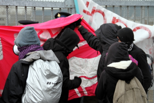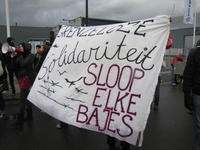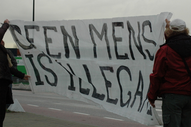 Zaterdag 7 november was onze lawaaidemonstratie gepland in Zaandam. Ondanks het druilerige weer was de opkomst groot, met ruim 50 mensen waren we in het troosteloze industriegebied in Zaandam om mensen die in de uitzetbajes zaten een hart onder de riem te steken. Ondanks dat dit soort uitzetbajessen zo ver van de bewoonde wereld worden neergeplemd, weerhoudt het mensen niet om er naar te te komen. Of het nu per fiets, openbaar vervoer of te voet is, we komen er wel. Enigszins vertraagd begonnen we met de demonstratie (sorry voor de mensen die op tijd waren, dat gaan we de volgende keer anders doen!) maar de spirit was er niet minder om. Op verschillende plekken hebben we geprobeerd contact met de mensen binnen te zoeken. Wat zeker lukte aan de kant van de vaart waar de luchtplaatsen zitten. Deze keer waren namelijk de mensen niet opgesloten in hun cellen, maar mochten ze tijdens onze actie naar buiten om te luchten. De mensen waren zeer dankbaar voor onze ondersteuning. D'r was hier en daar wel wat smeris op de been, maar dit keer lieten ze ons met rust en ons onze gang gaan. Wel werden we veelvuldig gefilmd en in de gaten gehouden, alsof dat ons in de toekomst tegen zal houden!. Ook de pers was in grote getale op komen draven, verlekkerd door het tendentieuze rapport van de AIVD over het asielprotest, dachten ze blijkbaar dat er meer zou gebeuren? Maar daarvoor kiezen mensen hun eigen moment en eigen tijd om het asielbeleid te saboteren, nu was het tijd om aandacht aan de slachtoffers van dit beleid te geven. En we kunnen zeker terug, er staat een nieuwe lawaaidemonstratie in de planning. Houdt deze en andere websites in de gaten. Ook Werkgroep Stop Deportaties en het Aagu houden regelmatig solidariteitsdemonstraties bij uitzetbajessen. “Geen mens is illegaal!” ps. Een volgende actie georganiseerd door ons is weer een picketline bij de uitzendbureau's Randstad en Adecco vanwege hun aandeel in het moorddadige uitzetbeleid: dinsdag 17 november. Meer info volgt snel. Brique par brique Mur par mur Detruisons toutes les prisons!