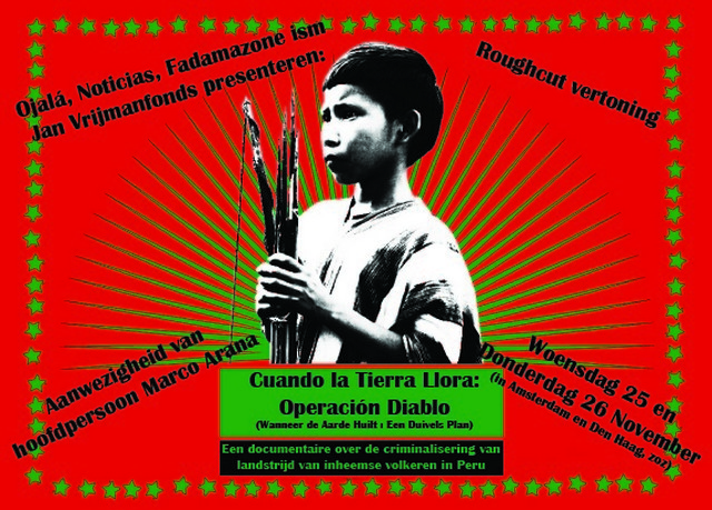 (Castellano abajo) Info avond: Peruaanse milieuactivist en presidentskandidaat Marco Arana Voorvertoning documentaire Operation Devil en debat over gevolgen van mijnbouw multinationals in Peru. Marco Arana is milieuactivist en oprichter van Grufides, een Peruaanse mensenrechten en milieu organisatie ( http://www.grufides.org/ ). Al twintig jaar zet hij zich in om de negatieve gevolgen van mijnbouw in de Noord-Peruaanse regio Cajamarca aan het licht te brengen. In deze regio wordt al jaren op grote schaal goud gedolven door multinationale mijnbouwbedrijven. Arana en Grufides ondersteunden de lokale bevolking in hun strijd tegen landonteigening, milieuvervuiling en andere gevolgen van mijnbouw. Vanwege zijn werk is hij meerdere malen slachtoffer geworden van bedreigingen en de mijnbouwbedrijven voeren een voortdurende lastercampagne tegen hem. Zijn activisme tegen de praktijken van mijnbouwmultinationals leidde tot een laster en intimidatie campagne tegen hem, waarop Amnesty International in 2008 in actie kwam om Marco Arana bescherming te bieden (zie: http://www.amnesty.ca/take_action/actions/peru_hrds_threats_intimidation. php) Dit jaar heeft Marco Arana een linkse politieke partij opgericht, Tierra y Libertad ( http://tierraylibertad.blogcindario.com/), met als doel de thematiek van landrechten en milieu bescherming op de nationale politieke agenda te krijgen. Tierra y Libertad pretendeert ook vernieuwend te zijn wat betreft horizontale organizatie en nauwe banden met verschillende sociale bewegingen. Namens deze partij zal hij deelnemen aan de komende presidentsverkiezingen in 2011. Op 25 en 26 November is Marco Arana in Nederland en zowel in Den Haag als in Amsterdam vertoont hij een 'werk in uitvoering versie' van de documentaire 'Operation Devil' die in 2010 op het Internationale Documentaire Festival Amsterdam (IDFA) in première zal gaan. De documentaire gaat over zijn activisme en de bedreigingen die Marco ontving van multinationale mijnbouwbedrijven als reactie op zijn millieu activisme ( http://www.idfa.nl/industry/Festival/films/project.aspx?id=f555f37d-20d6-49c5-8356-7cf6a1a07b6b). Ook zijn twee jonge Belgische onderzoekers aanwezig (Thomas en Marijke Deleu). Zij waren aanwezig in de Peruaanse Amazone in april dit jaar, toen inheemse groepen in opstand kwamen tegen d euitverkoop van hun gebied aan multinationale mijnbouw- en olie bedrijven. Ze maakten indrukwekkende foto’s van de bloedige confrontatie met de politie die de hele wereld overgingen( zie: http://www.catapa.be/nl/nieuws/338 ).Ojala organiseerde in juli dit jaar een informatiebijeenkomst waar zij hun ooggetuigen verslag vertelden (zie: http://www.ojala.nl/index.php?n=Globalization.Nochesolidaridad ). De afgelopen 3 maanden zijn zij wederom in de Peruaanse Amazone geweest om de gebeurtenissen van april te reconstrueren en om andere tema’s met betrekking tot landstrijd van inheemse bevokingsgroepen in kaart te brengen. Zij zullen op de avond van Marco Arana de introductie tot thematiek van landrechten in Peru verzorgen. Woensdag 25 november in Den Haag De Boskant Fluwelen Burgwal 45 Van 20.00-22.00 Donderdag 26 November in Amsterdam Latijns-Amerika Centrum Nieuweherengracht 29 Van 19.30 – 22.00. Entree is gratis (vrijwillige bijdrage wordt op prijs gested). Beide avonden zijn in het Nederlands en Spaans. De docu is in het Spaans met Engelse ondertiteling. Zie voor meer info: www.ojala.nl -- Noche de Información: Ecologista y candidato a la presidencia Marco Arana Premuestra del documental ‘Operation Devil’ y un debate sobre las negativas consecuencias de la minería en Peru. Marco Arana es ecologista y fundador de Grufides, una organización peruana para los derechos humanos y el medio ambiente. Ya lleva veinte años esforzándose para revelar las consecuencias negativas de la minería en la región de Cajamarca en el norte de Peru. De muchos años, multinacionales mineras extraen el oro en esta región y Arana y Grufides apoyan a la población local en la lucha contra la expropiación de tierra, la contaminación ambiental y otras consecuencias de la minería. Por su trabajo está sufriendo amenazas y las explotaciones mineras hicieron una campaña de difamación continua contra su persona. Este año Marco Arana ha establecido Tierra y Libertad, un partido político de izquierda, con el objetivo de poner la temática de los derechos terrestres y la protección del medio ambiente en el foco de atención. Arana participa en las elecciones presidenciales en 2011 representando este partido. El 25 y el 26 de noviembre, Marco Arana está en Holanda y igual que en La Haya que en Amsterdam muestra su versión ‘en obra’ del documental ‘Operation Devil’ que se estrena en el Festival Internacional de Documentales de Amsterdam(IDFA)de 2010. El documental trata de su activismo y de las amenazas que está sufriendo. Tambien estarán presentes dos dos jóvenes investigadores belgas, Thomas Quirynen y Marijke Deleu , que los últimos dos meses han estudiado la criminalización del movimiento indígena en la Amazonia Peruana. Tras la película hay tiempo para intervenir en un debate sobre las consecuencias de la minería, los derechos terrestrales y la criminalización de los movimientos sociales en Peru. Miércoles, 25 de noviembre 20.00-22.00 Noche de Información/Discusión en La Haya organizado por Fadamazon. El programa incluye la muestra del documental ‘Operation Devil’. De Boskant Fluwelen Burgwal 45 La Haya Jueves, 26 de noviembre 19.30-22.00 Noche de Información/Discusión en Amsterdam organizado por Ojalá y Noticias. El programa incluye la muestra del documental ‘Operation Devil’. Latijns Amerika Centrum Nieuwe Herengracht 29 Amsterdam E-Mail: ojala@ojala.nl Website: http://www.ojala.nl | | Flyer nog een keer proberen | Ojala/noticias.fadamazone - 19.11.2009 09:00