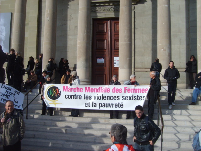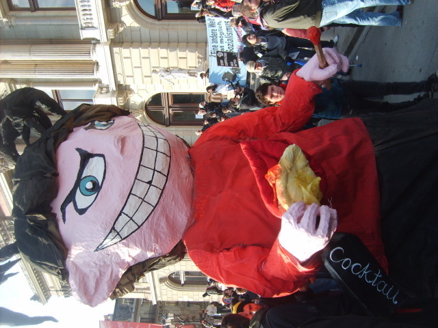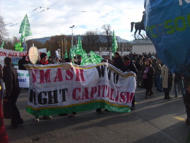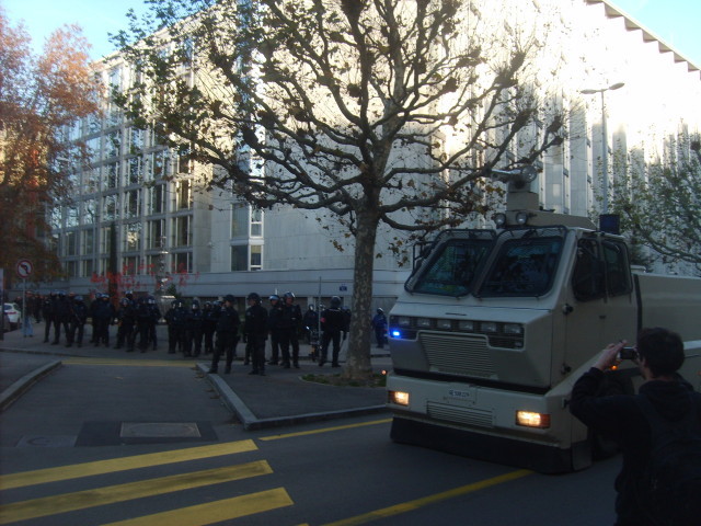 Het gebeurde iets anders: het militante blok zat ergens middenin en bleef daar ook, van daaruit werd inderdaad af entoe een bank aangepakt. Na 3 kwartier bedacht de politie dat het genoeg was en zette traangas in. Pas toen raakte alles door elkaar, rennen en af entoe vanuit zijstraten onder traangas genomen, ook jaagt er een groep ME-ers op motoren waarvan de bijrijders schoten. Demonstratie raakte daardoor uit elkaar en bereikte nooit WTO en eindpunt. Boel lijkt nu (19.00 uur) rustiger. In theater rue de carouge begint nu cultureel programma en debatten en yo | | 2e poging | GI - 28.11.2009 19:44