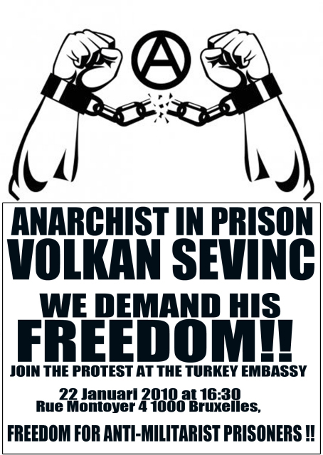 Kom allen op vrijdag 22 januari 2010 om 16:30 naar de Turkse Ambassade in Brussel, Rue Montoyer 4 1000 Brussel Voorverzamelpunt in Gent: 15:00 aan Gent-Sint Pietersstation  Vrijheid voor de Turkse Anarchist Volkan Sevinc, de antimilitarist Enver Aydemir en alle andere slachtoffers van de staatsrepressie! Op 6 januari 2010 vielen agenten in Ankara met geweld activisten aan van het Solidariteit Initiatief met gewetensbezwaarde Enver Aydemir, waarbij 23 mensen werden gearresteerd. De activisten eisten vrijlating van de gewetensbezwaarde Aydemir, die in de militaire gevangenis is gemarteld. Ze gebruikten in het politiebureau hun recht om te zwijgen. 22 van hen werden vrijgelaten na hun ondervraging door de openbare aanklager nadat ze 24 uur in de gevangenis hadden doorgebracht. Echter, een van hen, een zeer actieve Anarchistische activist Volkan Sevinc, werd gevangen gezet. De rechter verklaarde de actie tot een "onwettige bijeenkomst” en Volkan Sevinc werd beschuldigd van het organiseren van die bijeenkomst, en het bezit van een pistool. Later hebben ze besloten dat hij de kans had om het bewijsmateriaal te laten verdwijnen. En als een bewijs kwamen ze met een mes, hoewel hij verklaarde dat het niet van hem was en hij weigerde zich te laten fouilleren. En de wet van de macht, die stelt dat hij de illegale bijeenkomst 'beheerde', plaatste Volkan in de Nr. 1 gevangenis van Ankara. Terwijl Volkan naar de gevangenis werd gebracht riepen zijn kameraden en ondersteuners leuzen. Iedereen daar riep dat ze schouder aan schouder lopen tegen het fascisme en dat de redding gezamenlijk zal komen, niet alleen. Dat bracht Volkan er toe zijn vuist te ballen en indruk te maken met de leuze "Rebellie, Revolutie, Anarchie". Als gevolg hiervan werd Volkan Sevinc gevangen gezet, omdat hij de dood en het moorden verwierp. Laat ons solidariteit betuigen met de slachtoffers van de vervolging en de repressie op de anarchistische en anti-autoritaire beweging in Turkije! Kom allen op vrijdag 22 januari 2010 om 16:30 naar de Turkse Ambassade in Brussel, Rue Montoyer 4 1000 Brussel Voorverzamelpunt in Gent: 15:00 aan Gent-Sint Pietersstation E-Mail: arodearode@gmail.com |