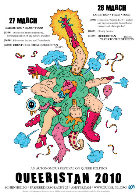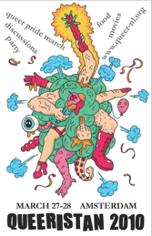 nnouncing the queer event of the year, Queeristan 2010 ! Workshops, discussions, queer pride march, party, arts, films ... need we say more ?  Queeristan 2010 Announcing the queer event of the year, Queeristan 2010 ! Workshops, discussions, queer pride march, party, arts, films ... need we say more ? When : March 27-28, 2010 Where : Schijnheilig, Passeerdersgracht 23, Amsterdam Contact : queernl@gmail.com Website : www.queer-nl.org/queeristan Language: Dutch and English (with translations) Programme March 27th 13.00 : Discussion 'Homonormativity, commercialisation of gay culture, and class' 16.00 : Discussion 'Sexism and Transphobia' 19.00 : Dinner 22.00 : Party : Creatures from Queeristan (performances at midnight) March 28th 12.00 : Lunch 13.00 : Discussion 'Racism, LGBT asylum and migration rights, homophobic violence and islamophobia' 16.00 : Closing session 17.00 : Queeristan takes to the streets ! Discussion workshops We are organising three discussion sessions on current LGBT/queer political issues facing us in The Netherlands. Each workshop will lead with brief presentations from some panelists, followed by an open discussion amongst everyone present. We hope to try and evolve political responses to the questions raised by the panelists. We also intend each session to lead towards concrete plans for the future in terms of working/action groups or collaborations with existing networks. To achieve all this, we invite LGBT/queer people, academics, activists, students, organisations and anyone else interested irrespective of personal identity, to come and participate. The first discussion will deal with the depoliticisation of the LGBT community, establishing links to other struggles, the increasing commercialisation of gay culture, as well as Amsterdam Canal Pride and its lack of politics of emancipation, and how these are linked with economic capabilities of LGBT people. The second discussion is about sexism and transphobia, both in society at large, as well as within the LGBT people, and how we can get gays, lesbians, trans and bi people to share a common political and social space. The third discussion will be on the issues of LGBT asylum laws and links to immigration rights, experience of lgbt immigrants and racism, as well as exploring the issue of patterns of homophobic violence, islamophobia, and public/media perceptions. Queeristan takes to the streets ! Queeristan 2010 will end with all of us taking to the streets in the city. This march celebrates not only the diversity of gender identities and sexualities amongst us, but also the diversity of people and groups who are in solidarity with a queer and LGBT perspective. The march is an open, non-commercial, non-party political march with a clear anti-racist, anti-sexist perspective. We invite everyone - all individuals and LGBT organisations, as well as activist groups working on sexism, racism, immigration rights, anti-militarism, anti-deportation camps, environment etc, to come march with us through Amsterdam. Other events We will be celebrating Queeristan with a fabulous party, `Creatures from Queeristan' on saturday evening, so be there ! If you would like to perform at the party, contact us. There will be film screenings and an art space as well. It would be appreciated if you could let us know by email if you will be having (vegan) dinner/lunch with us. If you want more information, or want to get involved, get in touch ! E-Mail: alexander_postema@versatel.nl Website: http://www.trutfonds.nl/TRUT_QUEERISTAN_2010.html |