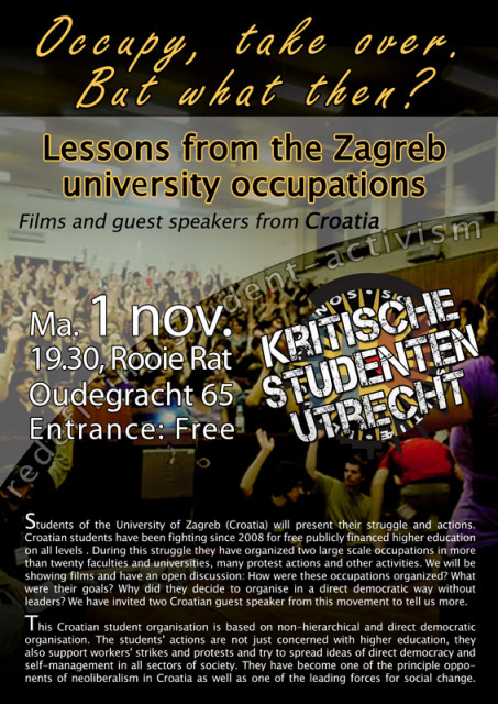 Students of the University of Zagreb (Croatia) will present their struggle and actions. Croatian students have been fighting since 2008 for free publicly financed higher education on all levels . During this struggle they have organized two large scale occupations in more than twenty faculties and universities, many protest actions and other activities. We will be showing films and have an open d…iscussion: How were these occupations organized? What were their goals? Why did they decide to organise in a direct democratic way without leaders? We have invited two Croatian guest speaker from this movement to tell us more.