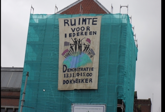 Spandoek oproep demonstratie hangt nog steeds op het Damrak. Een oplettende burger fotografeerde het volgende... | | Ruimte Voor Iedereen - videos | Spirit Of Squatters Collective - 15.11.2010 02:41