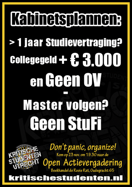 Kritische Studenten Utrecht organiseert een open actievergadering om plannen te maken voor acties tegen de bezuinigingsplannen in het hoger onderwijs van kabinet Rutte.