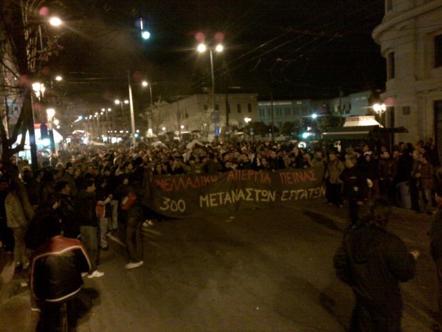 Solidarity to the struggle of the 300 hunger strikers How many times do they have to risk their lives in order to confirm their and our existence? In order to have the right to live with dignity and hope, in a country that seeks for scapegoats in those who are the most vulnerable and weak. For the migrant who, with his/her own blood, his/her poorly paid work and his/her creativity, make the country’s economic machine move on. For those who’re seeking for freedom and fleeing from neediness, war or some other short of «peaceful» occupation, cross the borders in search of a better life. For the migrants who lost their lives at the national borders of the European countries, for the 13.000 certified victims of the security doctrine since 1993 and the thousands of persons still missing. For the migrants’ children who from their early age grow with legal and social constraints and exclusions. In order to bring forward and establish to the common consciousness, as struggle and cause, the joint social interests of Greeks and migrants who produce the social wealth in every short of services, in constructions, in factories, in the fields, in domestic works – as well as the common social interests of the unemployed people. For the reasons mentioned above and other unmentioned here: - We express our solidarity to the 300 migrants, hunger strikers - We demand the unconditional legalization for all migrants - We support the migrants’ demands for equal political and social rights and duties with the Greek workers January 2011 Solidarity Assembly to the Migrants Hunger Strikers