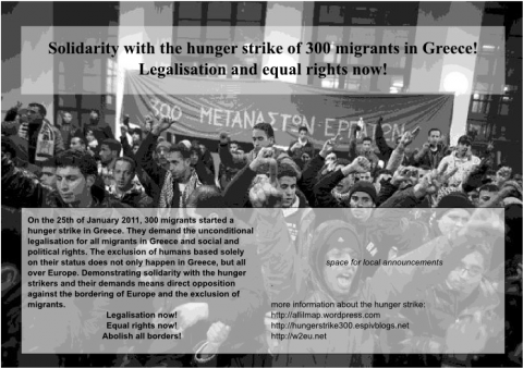 The hunger strike of the 300 has been going on for over a week now. The reactions in Greece are quite strong  The hunger strike of the 300 has been going on for over a week now. The reactions in Greece are quite strong, a lot of people and organisations have expressed their solidarity with the hunger strikers, however, the state has not been idle either, first attacking the hunger strikers because of their choice of place to hold the strike, then threatening their eviction by force. Now they are also going after the supporters, threatening them with legal action. It is time that we show our solidarity! We call for a European Week of Solidarity with the hunger strike, from the 7th to the 13th of February. Not only are there Greek consulates and embassies all over, the problem is a European one, so there are plenty of places to go and to protest. We’ll keep this post updated with actions going on, so please drop us a comment if you plan to do something. We have also prepared some flyers (in english and german) which you can use to mobilise. They are in .svg format, there is an excellent open source programme called inkscape you can use to edit them (then you will also see that there is some text in it). We’d be happy for more translations! Actions planned so far * Frankfurt * Leipzig * Munich * Berlin Website: http://w2eu.net/2011/02/02/300-european-week-of-solidarity-with-the-hunger-strike/ |