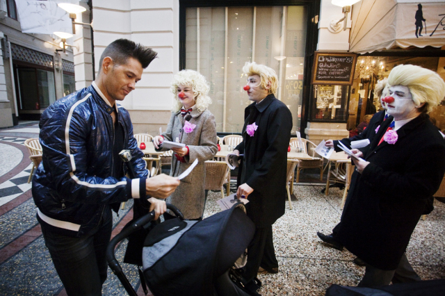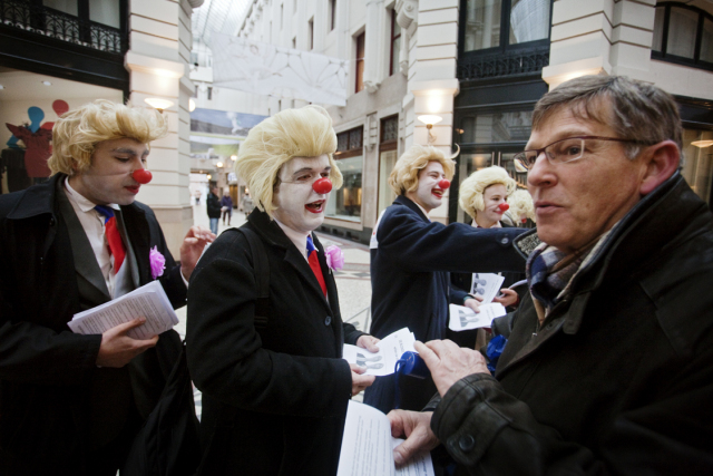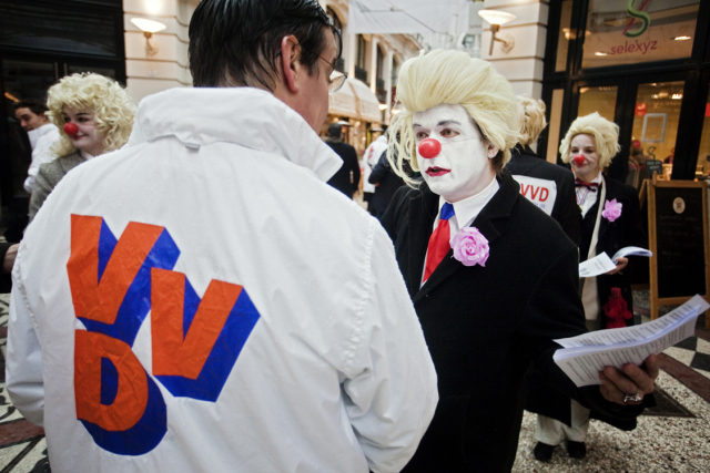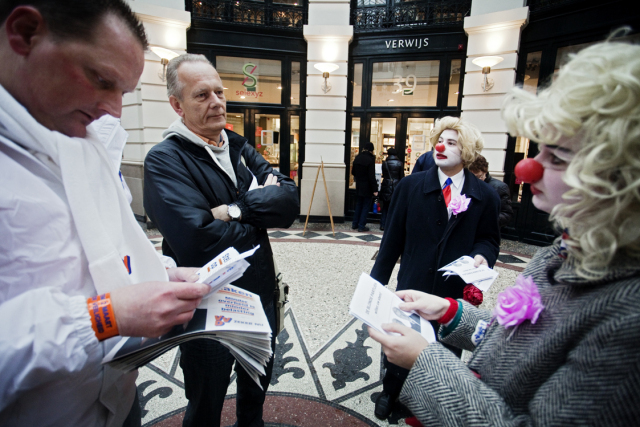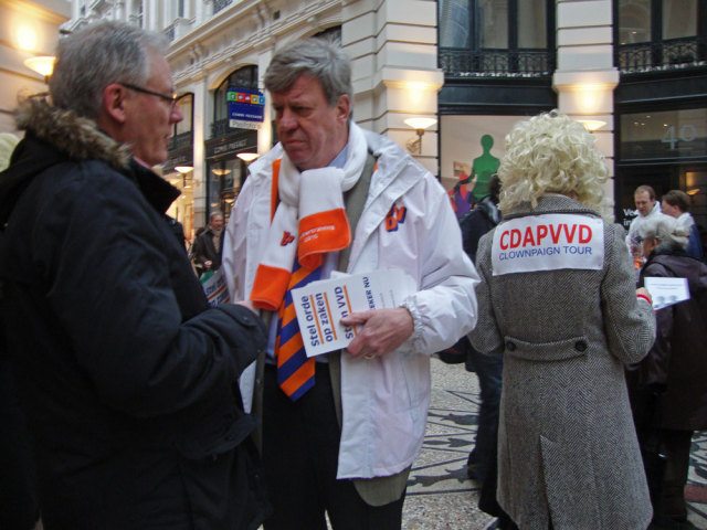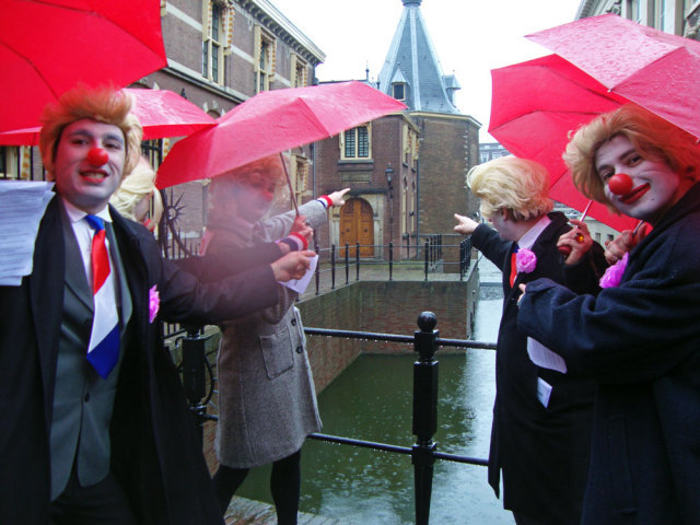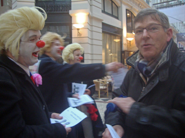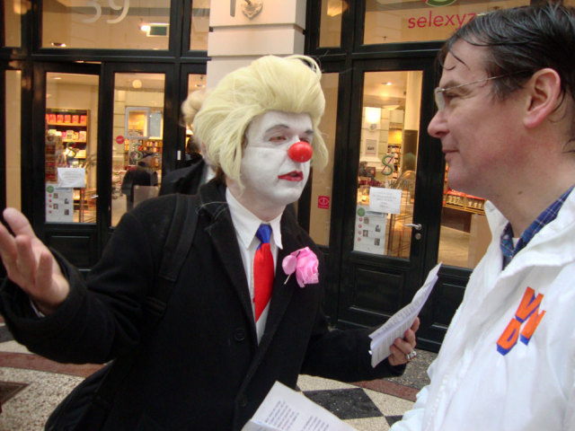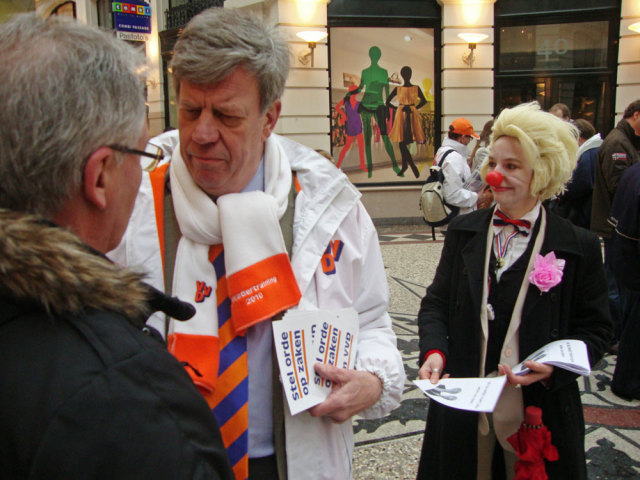 Next week (We. March 2nd) elections in the Netherlands: the provences and indirectly the senate. Unsure if the right-wing populist government will get a majority. So it's about time to give them some help! Rebel clowns started a promotion campaign for the CDAPVVD, the 3 in 1 party responsible for loads of measures coming our way. The Hague was the place to be! Saturday, Febr. 26th: it should be the most exciting campaign day before the elections: it wasn't... It was raining and we were in the Hague. We started 11.00 o'clock our clownpaign tour in the Vlamingstraat and Spuistraat: a boring shopping area. There we met our first colleagues from the Christendemocrats CDA, had a nice chat with them and went further in the direction of the Hofvijverweg - because we had 1 big desire: meeting our dearest friends of the rightwing liberal party VVD and especially Ivo! Ivo who? Ivo Opstelten, the minister of Security and Justice! Wowww; he's a hell of a campaigner! It was raining and VVD and clowns have 1 very important thing in common: they don't like rain!! So we spent hours together in the indoor shopping streets the Passage. And that was fun! Ivo wasn't alone; he had company of several other VVD-campaigners. They had their flyers. We had our flyers. For sure we spread more flyers than them! Competition is a clown liberal principle! We had a great flyer with a fantastic heading "The Blond Parties want your vote" with a picture of prime-minister Rutte (VVD) and minister Verhagen (CDA). Both with a Wilders (PVV) wig. And a text in Dutch with 12 important points like for example: "All non-Dutch animals should leave the country: the highland cows back to Scotland, elefants to Africa and hamsters to Asia!" "Less nature (all trees look the same) and more asphalt!" "No money, no masters degree: let the elite be educated!" "More Dutch troops, police and animal cops to Afghanistan! And 10 billion for JSF-fighters!" To be honoust: our beloved friend Ivo didn't do much. He talked very, very long with people he already knew and several times he enjoyed the terrace seats. In the meantime we continued leafleting and tried to convince people how wonderfoool the blond parties are doing their thing. Not everyone agreed. Some people made statements they don't want to be in touch at all with Wilders and the other blond parties. And there were also some PVV-fans who thought we were making fun of Wilders and showed their middle finger. One of our clowns was pushed by a PVV-fan. But loads of people accepted the flyers with a smile. Some of them even asked for more to spread at home! What else could you wish during a CDAPVVD clownpaign tour?! Finally we accepted the rain should take hours and left the indoor area. Walked around the Binnenhof, city hall and other shopping streets. Had contact with campaigners from other parties, but most of all with many very nice people from the Hague. After more than 4 hrs of clownpaigning all our flyers were gone. Time for a break, time for a beer! Pictures and film will follow E-Mail: rebelact@ddh,nl Website: http://www.rebelact.nl |