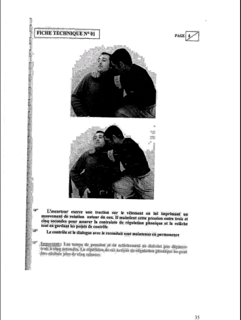Hoe stel je een vreemdeling ‘gerust’ vlak voor zijn uitzetting? Hoe druk je zijn keel dicht om zijn kreten te verhinderen? Hoe zorg je ervoor dat passagiers in het vliegtuig niet in opstand komen? De antwoorden op deze vragen, en nog veel meer, vind je in het handboek voor escortes van de Franse Grenspolitie (Police Aux Frontieres).    http://www.frenchleaks.fr/Le-manuel-des-policiers-de-la-PAF.html Uitgezet worden met een lijnvlucht of met een speciale charter: na het lezen van het handboek weet je hoe dat in zijn werk gaat – in theorie althans. Delen van het handboek zijn inmiddels vertaald in het Nederlands: Uit de taakomschrijving van de politie-escorte: “Indien nodig zet de politie-escorte proportionele dwang tegen verzet in, teneinde de persoon oordeelkundig te overmeesteren. Hij past professionele ingrijptechnieken toe en gebruikt de materialen die tot zijn beschikking staan, afgezet tegen het gedrag van de uit te zetten persoon. Toevlucht nemen tot dwangmiddelen en geluidsregeling (telkens 3 tot 5 seconden, niet langer dan 5 minuten) is het uiterste inzetbare middel voordat de uitzetting wordt gestopt.” UITZETTEN PER LIJNVLUCHT Voor het vertrek van het vliegtuig Vanaf het begin van de inschepingprocedure nemen de begeleiders een beleefde houding aan tegenover de vreemdeling, maar ook een besliste houding – er is geen ander alternatief dan de zekerheid van zijn inscheping naar de vastgestelde bestemming. Escorts dienen zich correct te kleden, ze moeten uitstralen dat ze het ‘instituut vreemdelingenpolitie’ vertegenwoordigen. Het is verplicht te verwijderen personen voor vertrek te fouilleren, ook al is dat al gebeurd bij het verlaten van het detentiecentrum of de gevangenis. Fouilleren gebeurt met een metaaldetector en met de hand. Scheermesjes, scherp of afgesleten, zijn de gebruikelijke objecten die het meest gevaarlijk zijn om gevonden te worden. Ze zijn bedoeld voor oppervlakkige zelfverwondingen die overvloedig bloeden, met als doel het vertrek te belemmeren of het vliegtuig van koers te doen veranderen. Ze kunnen worden gevonden in een boek, een schoenzool, de revers van het overhemd, het jack, in de riem, in een pen enz. De procedure van het aan boord gaan Deze fase is extreem gevoelig om talrijke incidenten op te wekken die in aanmerking komen om de uitzetting van de te verwijderen persoon te beëindigen. Het maakt verschil of het een individuele of een groepsuitzetting is. • De weg naar het vliegtuig De te verwijderen vreemdeling wordt door personeel van de grenspolitie in het daarvoor gereserveerde gebied naar de loopbrug geleid. • Voor het aan boord gaan Afgezien van grote belemmeringen en volgens de instructie van de gezagvoerder, gaat de te verwijderen vreemdeling in een lijnvlucht altijd voor de passagiers aan boord. Deze fase zorgt ervoor dat de te verwijderen persoon in alle veiligheid, uit het zicht van de passagiers, plaatsneemt. Dwangmiddelen of fixatietechniek • Principe: er is sprake van het uitvoeren van een administratieve of juridische beslissing, zo nodig kan toevlucht worden genomen tot dwangmiddelen. Dat rechtvaardigt in voorkomende gevallen, conform de wet, het gebruik van strikt noodzakelijk geweld, zonder gewelddadigheden of niet-wettelijke mishandelingen. Het geweld en de te gebruiken middelen dienen proportioneel afgestemd te zijn op het te ontwikkelen verzet van de vreemdeling. • Om weerspannige vreemdelingen te immobiliseren wordt in herinnering gebracht dat alleen door de overheid goedgekeurde materialen uit de uitrusting mogen worden gebruikt.. Het gaat hier om metalen en stoffen handboeien, banden met klittenband en een bodycuff. Alle andere immobilisatiemiddelen zijn strikt verboden. Alle vormen van knevelen zijn strikt verboden. De aanwezigheid van alle door de overheid goedgekeurde wapens (vuurwapen, traangasbom….) is verboden aan boord van een luchtvaartuig. In het kader van een groepsuitzetting echter kan het beveiligingssysteem voorzien in het uitrusten van bepaalde personeelsleden met verdedigingsmiddelen voor gezamenlijke toepassing (schild, beschermende helm, wapenstok….). Het aan boord gaan De verschillende hieronder beschreven reeksen betreffen individuele uitzettingen aan boord van lijnvluchten. • De supervisor en de chef uitzetting moeten een persoonlijke relatie en voorbereiding vaststellen met de gezagvoerder, krachtens de civiele luchtvaart de enige gevestigde autoriteit van de politiemacht aan boord. Tijdens dit onderhoud wordt de gezagvoerder geïnformeerd over de houding van de te verwijderen persoon, de toe te passen procedure tijdens het aan boord gaan en de voorziene moeilijkheden. Dit zelfde geldt ook voor het vliegtuigpersoneel. • Aan boord gaan aan de achterzijde van het vliegtuig: In het algemeen worden de volgende schikkingen getroffen: • Gebruik van een loopbrug, geplaatst op afspraak met de coördinator van de luchtvaartmaatschappij; • Positiebepaling van de stoelen (altijd gesitueerd in de achterste regionen van het vliegtuig), overeind zetten van armleuningen en veiligheidsriemen om de opstelling te faciliteren in geval van sterk verzet; • Nazien van de opstelling van het veiligheidshek dat zich bovenaan de loopbrug bevindt. Aan boord gaan aan de achterzijde van het luchtvaartuig reduceert maximaal risicovolle incidenten of rebellie die zich plotseling zouden kunnen voordoen tijdens het lopen naar de toegang tot de gangpaden tot aan de gereserveerde plaatsen. Instappen en plaatsing van de opstelling van de escorte in het luchtvaartuig: • Positionering van de escortefunctionarissen: hetzij aan weerszijden van het individu, hetzij één voor en één achter, afhankelijk van de gevaarlijkheid van de te verwijderen persoon of personen; • Assistentie door de functionarissen van de P.A.F van het vertrekvliegveld; • Instappen van de uit te zetten personen, individueel geëscorteerd door de functionarissen. Opstelling op de stoel: • Dit moet snel geschieden vanwege observatie 