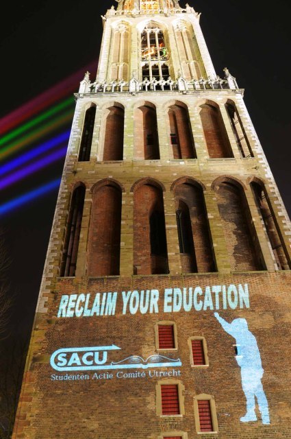 Studenten van het SACU hebben in de nacht van 25 maart de boodschap, “Reclaim your Education”, op de Domtoren geprojecteerd   Sinds een week wordt in het kader van het 375-jarig bestaan van de Universiteit Utrecht de Domtoren met een drie kilometer lange laserstraal beschenen. Een student van SACU legt uit: “Het College van Bestuur projecteert hun onderwijsvisie al jaren op studenten, met deze actie willen we uitbeelden dat studenten hun onderwijs terug moeten claimen.” De studenten protesteren met deze actie tegen het ondemocratische afbraakbeleid dat onderwijs-bestuurders de laatste jaren voeren. “Vorig jaar stopten ze de Universiteitskrant in de doofpot. Dit jaar zitten ze in een vijfsterrenhotel in Parijs plannen te maken om de studiebeurs af te schaffen, en dat terwijl de Collegevoorzitter Yvonne van Rooy er zelf vandoor gaat met een salaris ver boven de Balkenendenorm,” aldus een van de studenten. Naast de kritiek op het universiteitsbestuur willen de studenten ook aandacht vragen voor het belang van studentenprotest. Morgen gaan er uit het hele land opnieuw studenten de straat op gaan om te protesteren tegen de voorgenomen bezuinigingen in het onderwijs. De actievoerders roepen studenten, docenten en medewerkers ook op om mee te protesteren. |