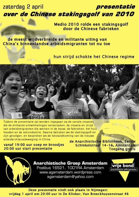 De Anarchistische Groep Amsterdam (AGA) en Doorbraak organiseren een tweetal presentaties over de Chinese stakingsgolf van medio 2010, getiteld “Het risico van verspreiding”. Naast de achtergronden en het verloop van de stakingen zal ook uitgebreid ingegaan worden op de betekenis voor de linkse strijd hier en elders in de wereld. De presentatie omvat ook filmbeelden en dia’s.  De bijeenkomsten: - Vrijdag 1 april om 20:00 uur in De Klinker, Van Broeckhuysenstraat 46, Nijmegen. - Zaterdag 2 april om 20:00 uur in de Anarchistische Bibliotheek, Eerste Schinkelstraat 14-16, Amsterdam (In Amsterdam is er vanaf 19:00 uur soep en een broodje). Toegang gratis. Medio 2010 rolde er een stakingsgolf door de Chinese fabrieken, de meest wijdverbreide en militante uiting van China’s binnenlandse arbeidsmigranten tot nu toe. Hun strijd schokte het Chinese regime en leidde tot een wereldwijd debat over het einde van het lage lonen-model. Op dat model is China’s groei tot “fabriek van de wereld” gebaseerd, een fabriek die Europa en andere regio’s van goedkope consumentenproducten voorziet. De presentatie zal gaan over de sociale situaties die de militante ontwikkelingen veroorzaken, over de situatie en strijd van arbeidsmigranten die werken in de bouw, de fabrieken, het huishouden en de seksindustrie. Daarna bekijken we de stakingsgolf en zijn gevolgen, en bespreken we de totstandkoming van de nieuwe arbeidersklassebeweging in China. De discussie zal zich ook richten op de nieuwe manieren hoe bewegingen van elkaar leren, informatie uitwisselen en elkaar steunen. Manieren die horen bij de huidige fase van de crisis en het toenemende aantal sociale strijden in diverse delen van de wereld. De presentatie zal gehouden worden door een van de redacteuren van diverse Duitse publicaties over de Chinese arbeidsmigranten, waaronder “Dagongmei – Women Workers From China’s World Market-Factories Tell Their Story” en “The Take-off of the Second Generation – Migrant Work, Gender and Class Composition in China”. Voor meer informatie zie: www.gongchao.org. Een vertaling van de introductie van hun Duitstalige brochure “Unruhen in China” is te vinden op de website van Doorbraak: “Onlusten in China”. Doorbraak organiseerde eerder (in juni 2009) twee zeer interessante bijeenkomsten over het verzet van “de Chinese fabrieksmeisjes” met dezelfde spreker. Bij de aankondiging daarvan staat een lijst met links voor meer informatie. Doorbraak en AGA E-Mail: agamsterdam@yahoo.com Website: http://agamsterdam.wordpress.com |