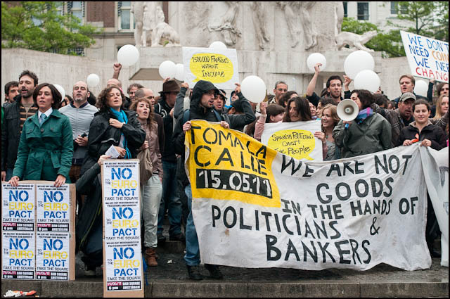 Ik heb een globale vertaling gemaakt en naar eigen smaak/inzicht aangepast en ingekort. NEE TEGEN HET EURO PACT! WE ZIJN GEEN SPEELTJES IN DE HANDEN VAN POLITICI EN BANKIERS. BEZET HET PLEIN ALS PROTEST TEGEN DE AFBRAAK EU-leiders staan op het punt om wéér de grote financiële bedrijven te bevoordelen ten koste van het publiek. Op 27 juni zullen de Europese overheden in Brussel een overal plegen van internationale omvang door de orders van het IMF, de ECB en de Wereldbank om te zetten in wetten. Wie van de regels afwijkt zal door internationale ratingagentschappen als Moody’s en Standard & Poor’s worden afgerekend. Waar tekenen de landen voor als ze het Euro Pact ratificeren? - Lagere publieke salarissen en minder publieke banen – minder leraren, schoonmakers, of buschauffeurs in publieke dienst en met lagere salarissen. - De pensioenleeftijd wordt 'aangepast' aan de leeftijdsverwachting - De pensioenen worden bevroren. - Arbeidsmarkten worden verder geflexibiliseerd zodat mensen voor altijd een precaire baan hebben - Uitkeringen worden gekort - Minder geld naar onderwijs, zodat dat ook privaat ingekocht zal gaan worden voor wie het kan betalen - Een constitutionele verandering zodat wettelijk is vastgelegd wat dat de IMF, het ECB, en de Wereldbank de regels bepalen Wéér zullen overheden hun politiek macht niet gebruiken om de veroorzakers van de crisis te stoppen. Alsof we nog niet genoeg hebben gehad, worden burgers wéér opgeofferd. In plaats van het even ondoorgrondelijke als verraderlijke financiële verkeer aan banden te leggen, wordt de oplossing weer gezocht in het verminderen van de arbeidskosten – in lagere lonen en minder geld naar publieke voorzieningen. Terwijl de salarissen van CEOs even hard stijgen als de werkloosheid, is er geen enkele politieke transparantie over wat de schulden inhouden en wie ze gaan betalen. ER ZIJN REDENEN GENOEG. GA DE STRAAT OP! NEEM HET PLEIN TERUG!