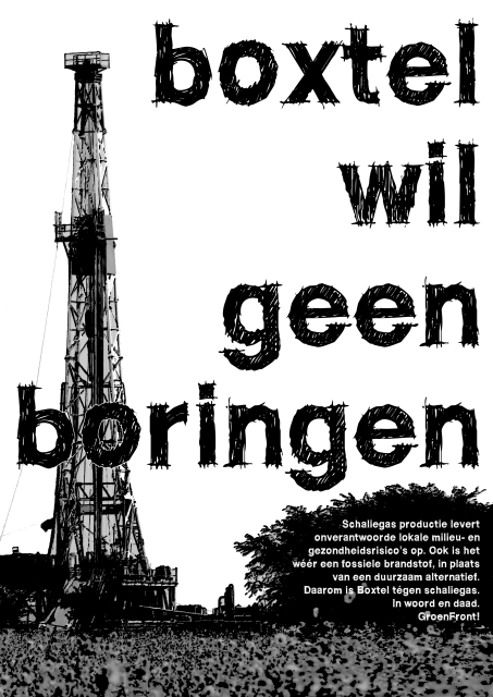"Boxtel wil geen boringen" en "Schaliegas, de slechte ideeen springen als boortorens uit de grond". 300 Posters met die slogans zijn sinds 18 oktober door heel Boxtel en Lennisheuvel te vinden. Activisten van GroenFront! hebben ze verspreid. "Maar ze staan ook op de website van GroenFront! voor wie ze uit wil printen en achter het raam wil hangen" alsdus Jochem Akkerman van GroenFront! Er is steeds meer weerstand tegen het proefboren naar Schaliegas in Boxtel. Ook tijdens het Tweede Kamerdebat op 27 oktober zal de publieke tribune vol zitten met verontruste inwoners uit deze plaats.