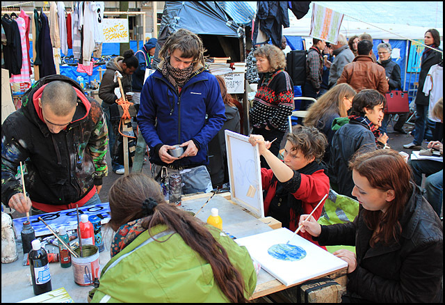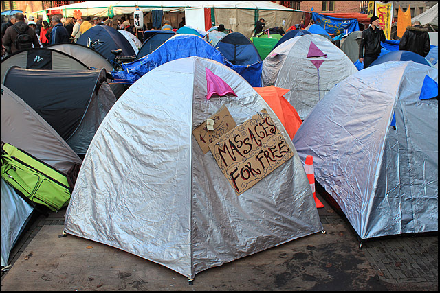 Nog meer tenten bijgekomen. Het blijft groeien. Mooi weer vandaag. Veel bedrijvigheid op het plein. Gezellig druk. Morgen demonstratie, verzamelen 12:00 Beursplein. Kom allemaal!