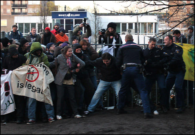 3. smeris trekt één voor één ingehaakte sympathisanten los by de ingang van tentenkamp..