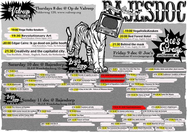 Van 8 tot 11 december is de eerste editie van het Bajesdoc festival Het gratis toegankelijke festival laat documentaires zien over milieu, mensenrechten en sociale conflicten in Nederland en de rest van de wereld. Veel docu’s zijn niet eerder of slechts enkele malen vertoond in Nederland. Docu’s als ‘Edgar Cairo: Ik ga dood om jullie hoofd’ (NL), ‘Los Meandros’ (CO) ‘Warrior of Love’ (IL), en ‘Revolutionary Art’ (NL) waarbij een Egyptische kunstenaar gevolgd wordt tijdens de revolutie dit jaar. Maar ook bekendere docu’s als ‘Red Forest Hotel’ (CH), ‘The Pipe’ (IE) en ‘Baba’ (NL) zijn te vinden in het programma.