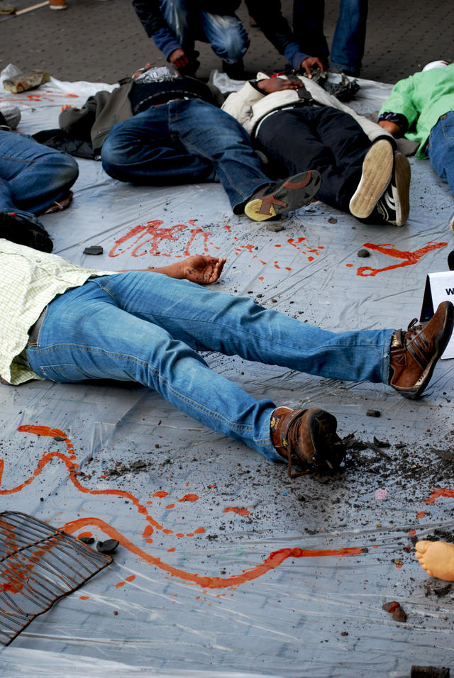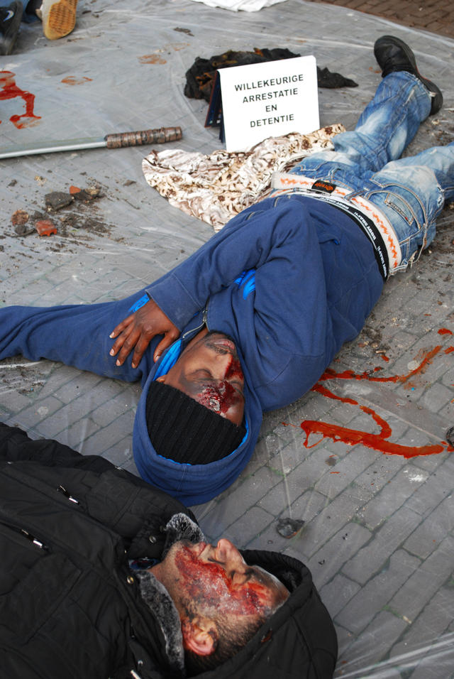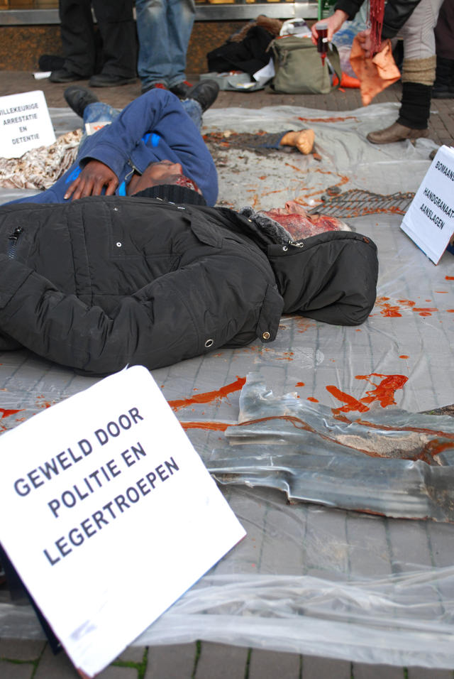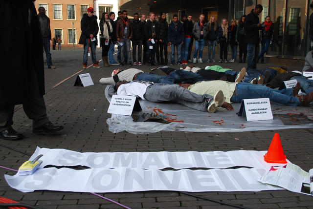 Vanmiddag, vrijdag 11 januari 2013 vond er een doodlig-actie plaats bij de Tweede Kamer in Den Haag. Uitgeprocedeerde en illegaal verklaarde asielzoekers uit Somalië, verenigd in de werkgroep ‘Somalië onveilig’, protesteerden hier tegen het oordeel van staatssecretaris Fred Teeven van Veiligheid en Justitie dat de veiligheidssituatie in Somalië dusdanig is verbeterd, dat het nu niet meer aangemerkt hoeft te worden als ‘onveilig land’. Dit betekent dat binnenkort de gedwongen uitzetting van Somalische asielzoekers weer mogelijk wordt.