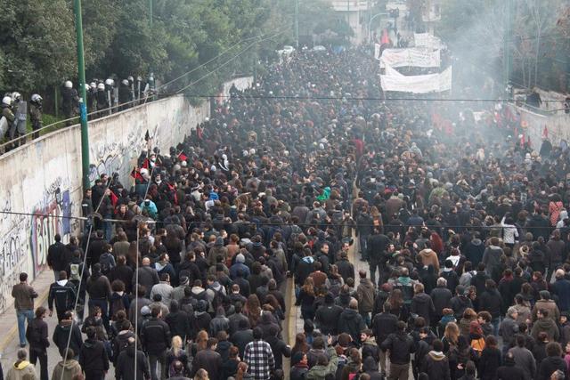 Vandaag was er een grote demonstratie in Athene ter verdediging van anarchistische sociale ruimtes. Dit volgde op de (her-)ontruiming van Villa Amalias en Skaramanga eerder deze week. Naar verluid waren er 10.000 mensen op de been in een demonstratie die eindigde bij het gerechtsgebouw waar de 93 arrestanten van de herkraak van Villa Amalias vandaag voor de onderzoeksrechter moesten verschijnen.