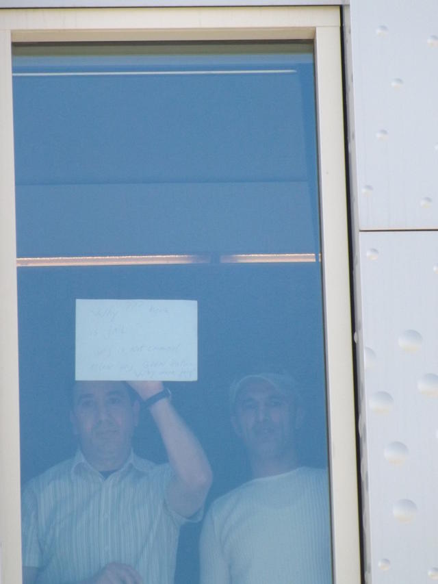 Two people in the detentioncenter of Rotterdam holding up a sign that reads: "Why??? here is jail? Wij is net criminel. [We are not criminals] Aleen wij geen papier. [We just don't have documents] Why we're here?"