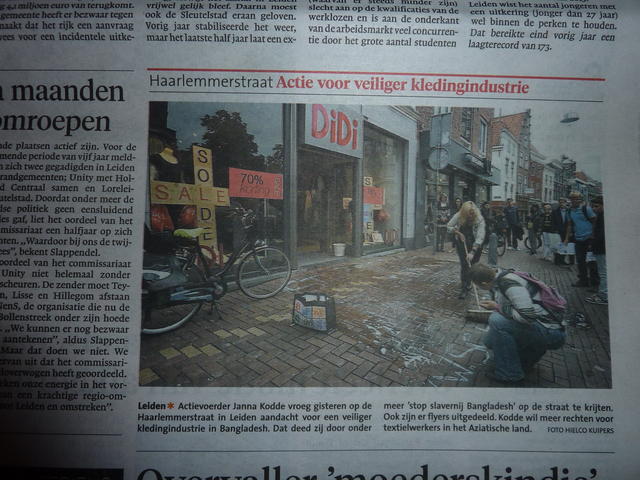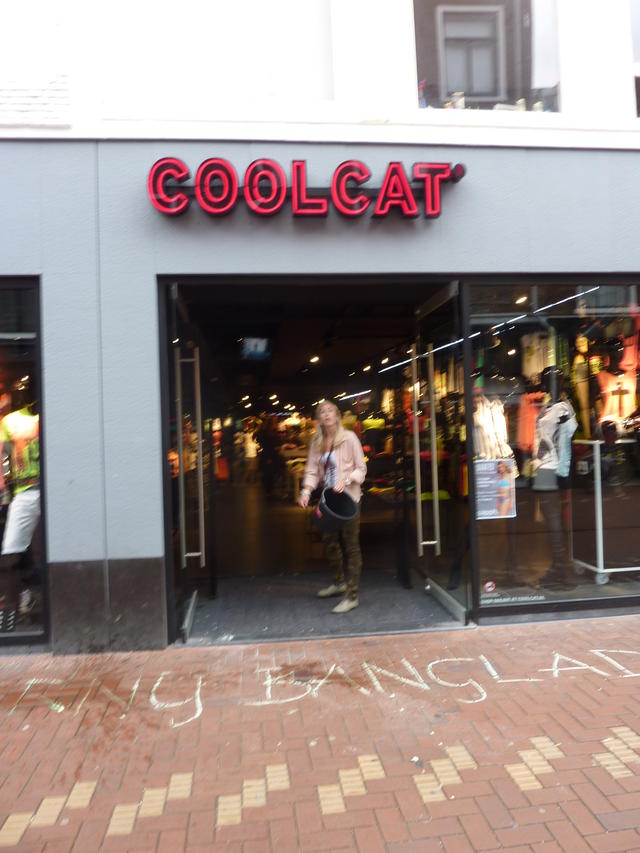 " De winkel waar deze actie op gericht is verkoopt kleding van een merk dat weigert de veiligheidseisen voor Bangladesh te tekenen. Dit merk is mede verantwoordelijk voor de ramp in Bangladesh waarbij ruim 1000 mensen zijn omgekomen omdat een ernstig onveilig gebouw waarin zij opgesloten zaten instortte. Please zeg tegen het winkelpersoneel dat Coolcat, Wibra, Didi, Prenatal en de Bijenkorf de overlevenden van deze ramp moeten compenseren. Ook is het levensbelangrijk dat Coolcat, Wibra, Didi en de Bijenkorf deelnemen aan ACCORD ON FIRE AND BUILDING SAFETY in Bangladesh. Praat hierover in de winkel of geef de flyer aan degene die er werkt. Wees solidair met deze onderbetaalde arbeidsters (vrouwen, mannen en jongeren) die zich voor een hongerloontje kapot werken om onze kleding te naaien. Teken ook de petities op www.schonekleren.nl en www.cleanclothes.org. STOP SLAVERNIJ IN BANGLADESH!"