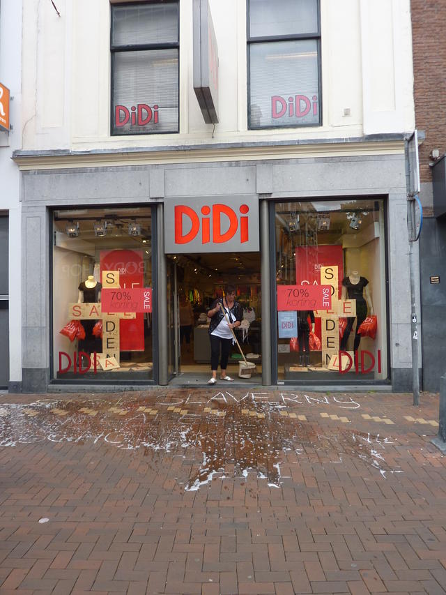 Er wordt wel erg paniekerig gereageerd op de leuzen door filiaalmanagers en personeel. Politie bellen voor een krijtleus is nogal flauw. Toch heb ik de afgelopen dagen al een paar keer smeris achter me aan gehad door telefoontjes van Prenatal en Didi.