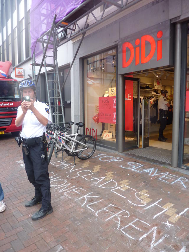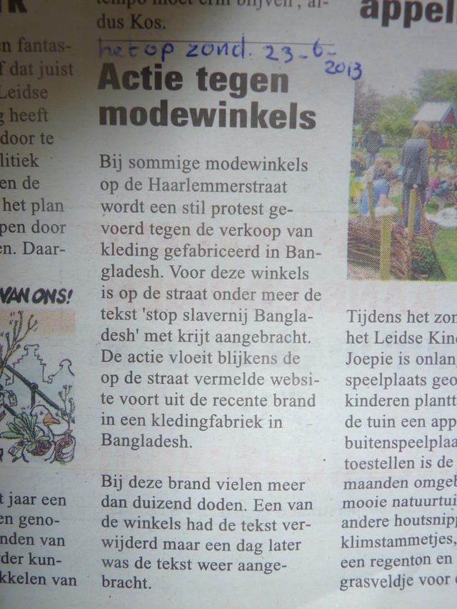 De filialen van de foute bedrijven (in verband met niet tekenen Safety Accord Bangladesh) in de Haarlemmerstraat in Leiden blijken finaal op de kast te zitten in verband met een paar simpele STOEPKRIJTACTIES. Ze hebben met zijn allen de politie verzocht bij mij aan de deur aan te bellen, en dat gebeurde dus zojuist. Een agent wilde een gesprek met me want die winkels hadden hem verzekerd dat ze allemaal ontzettend duurzaam en sociaal rechtvaardig bezig zijn. Dus het was volgens hen erg oneerlijk dat ik wil dat ze ook nog eens de fabrieken in Bangladesh veilig maken. Zo zie je maar weer mensen: met hele kleine softe acties kun je die lui helemaal gek maken. doe dat vooral in andere steden ook. Tegen de politie heb ik gezegd: vind je zelf ook niet dat het disproportioneel is om hiervoor bij mij op de stoep te staan? Ik bedoel: je denkt dan dat er iets ernstigs aan de hand is ofzo. Hij begreep niet dat ik het raar vond. Tsja, nou ja.....