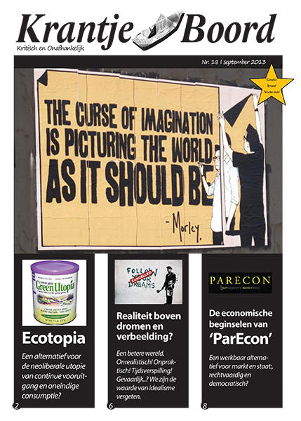Dit Krantje heeft een thema. Alles wat we doen, doen we omdat we willen werken aan een betere wereld. Streven naar een betere wereld lijkt wel op streven naar een ideale wereld, een utopie. Maar de waarde van utopisch gedachtegoed lijken wij in de huidige maatschappij een beetje te zijn vergeten. Lees hier waarom dromen van een betere wereld zo belangrijk is. Wees ook niet bang om toe te geven aan die dromen, want hier kun je leren hoe de ‘onrealistische en onpraktische’ mensen vaak meer kunnen bereiken dan de pragmatisten. En voor diegenen die utopisch denken een beetje eng vinden, vind hier ook twee voorbeelden van utopisch gedachtegoed: Ecotopia, rondom milieu en duurzaamheid, en Parecon, uitgaande van een rechtvaardiger economisch systeem. Maar nadenken alleen is niet genoeg. Lees ook een verslag van het No Border Camp dat plaatsvond in Rotterdam in augustus.