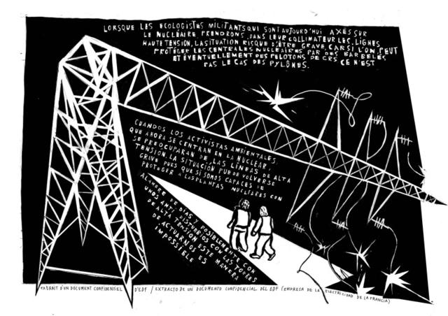 The ”very high tension electricity line” (M.A.T.) is an electric motorway which transports at least 400,000 volts. It is being constructed in order to connect European States to each other and also Europe with Africa. It is necessary in order to sell and distribute excess energy produced by nuclear power plants and the so-called alternative sources of energy. At the same time, it is the network which capitalism needs in order to supply the electricity necessary for other projects and infrastructures of death and destruction, such as high-speed railway lines. Those responsible for all this are always the same and the construction companies in question are directly involved in other projects which are destroying lands around the world; companies like Vinci standing out in Europe and Endesa in South America.