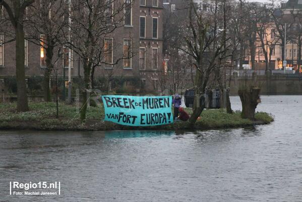 Vanochtend hebben twee activisten van ‘Breek Fort Europa’ korte tijd het eilandje in de Hofvijver in Den Haag bezet, met een spandoek ‘Breek de muren van Fort Europa’. De actie is een protest tegen het migratiebeleid van de Europese Unie, dat steeds meer levens van migranten eist, zoals bij de ramp bij Lampedus begin oktober. In meerdere Europese landen wordt vandaag actie gevoerd bij gebouwen van de EU. In Den Haag zal vanmiddag ook een demonstratie plaatsvinden.