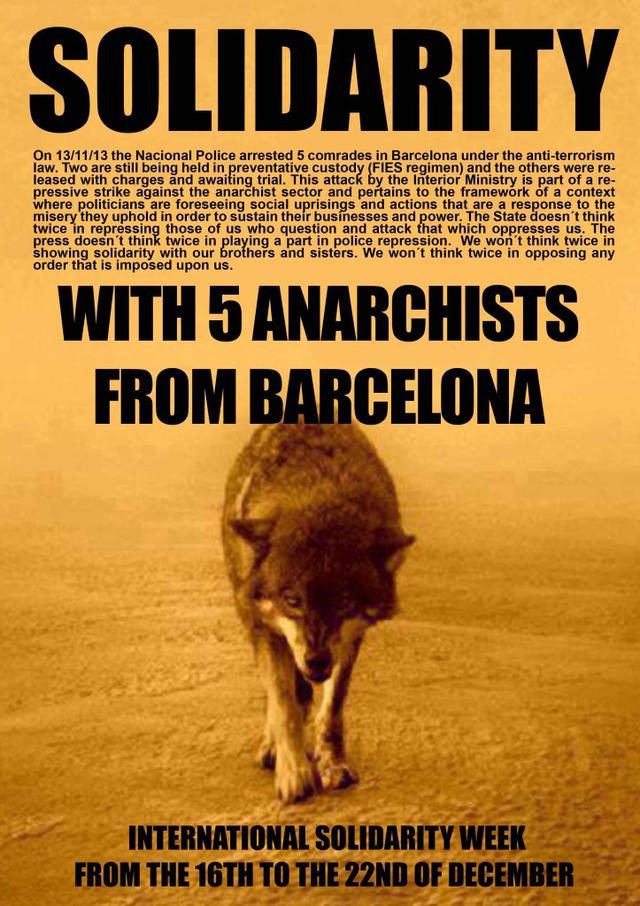 We zijn solidair met Monica en Francisco en anderen die beschuldigd worden in de meest recente repressie golf tegen de 'anarchiste' beweging in Barcelona. Het daadwerkelijke terrorisme is de staat die mensen [immigranten] vermoorde in de buurt Raval, in de detentiecentra en in politiebureaus. Ze surveilleren ons om zichzelf te beschermen tegen de woede die is ontstaan.