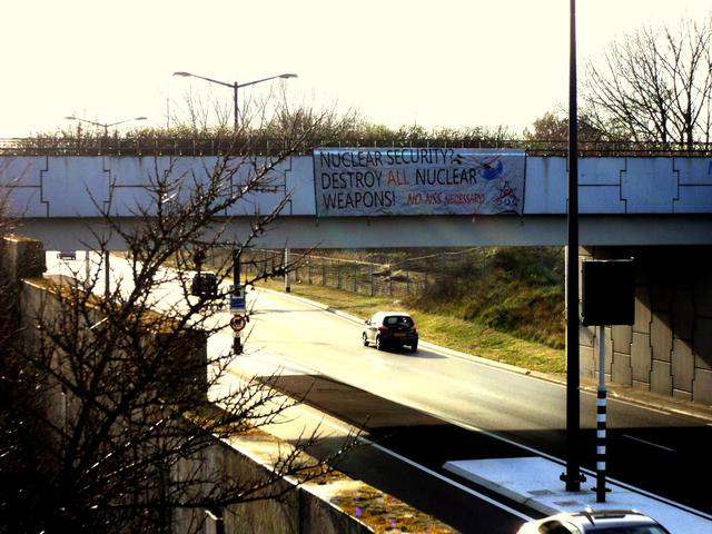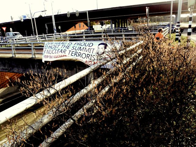 In the afternoon of Thursday March 20 several banners appeared at big roads in The Hague, protesting against the Nuclear Security Summit which is due to start on Monday.