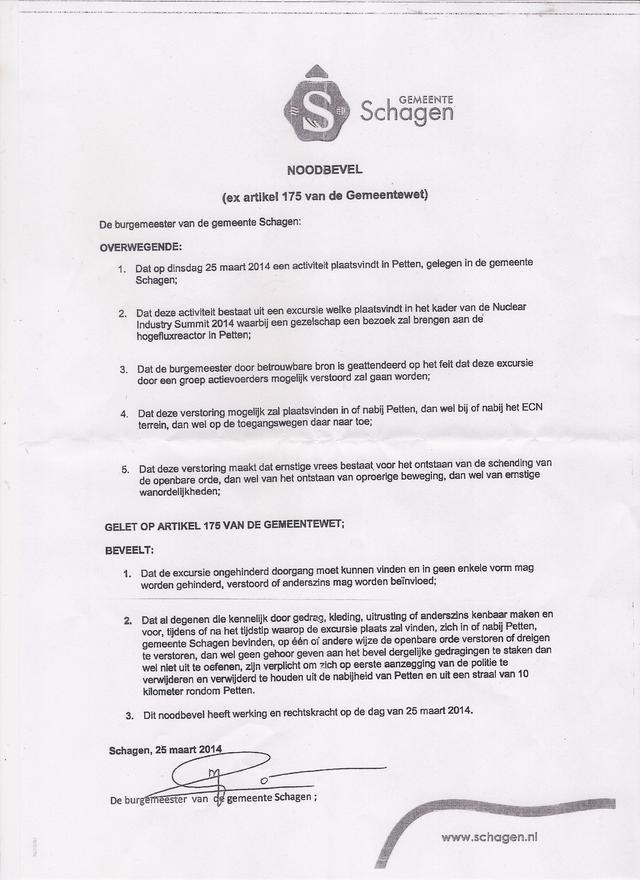 In Petten bleek voor vandaag een noodbevel uitgegeven door de burgemeester waardoor demonstraties binnen 10 km van Petten verboden waren: "al degenen die kennelijk door gedrag, kleding, uitrusting of anderszins kenbaar maken en voor, tijdens of na het tijdstip waarop de excursie plaats zal vinden" zo staat in de noodverordening "zijn verplicht om zich bij de eerste aanzegging van de politie te verwijderen en verwijderd te houden uit de nabijheid van Petten".
